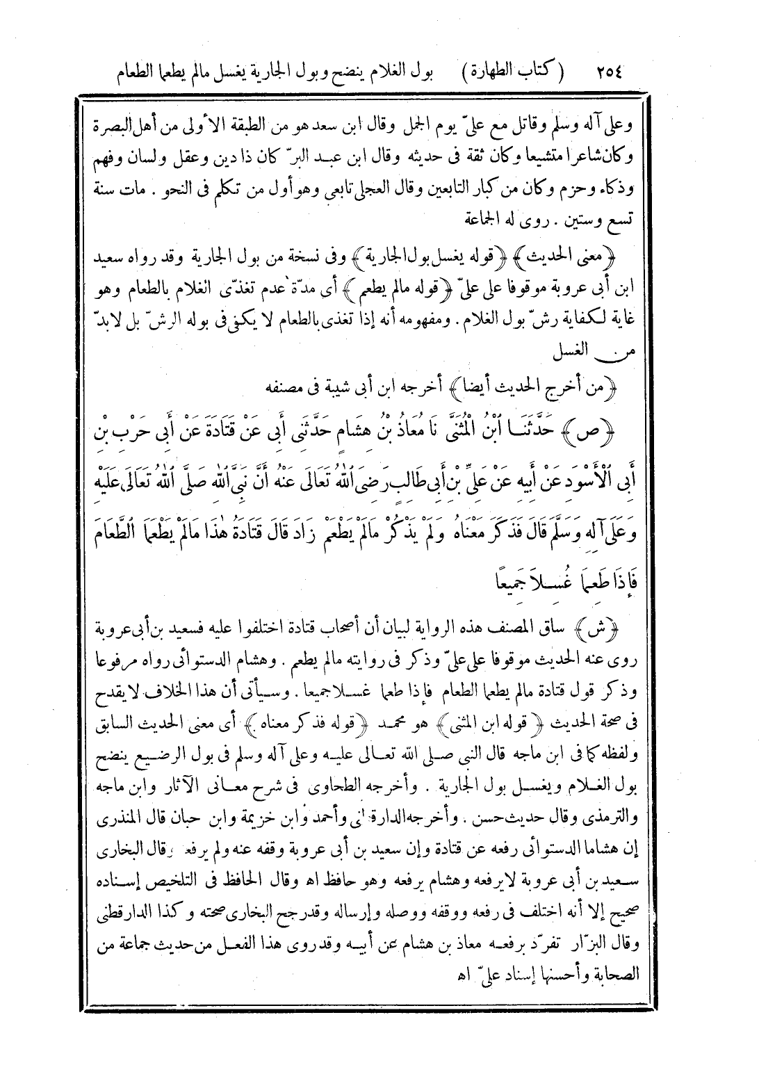 (ص) حَدَّثَنَا ابْنُ الْمُثَنَّى، نَا مُعَاذُ بْنُ هِشَامٍ، حَدَّثَنِي أَبِي، عَنْ قَتَادَةَ، عَنْ أَبِي حَرْبِ بْنِ أَبِي الْأَسْوَدِ، عَنْ أَبِيهِ، عَنْ عَلِيِّ بْنِ أَبِي طَالِبٍ رَضِيَ اللَّهُ تَعَالَى عَنْهُ، أَنَّ النَّبِيَّ صَلَّى اللهُ تَعَالَى عَلَيْهِ وَسَلَّمَ قَالَ: فَذَكَرَ مَعْنَاهُ، وَلَمْ يَذْكُرْ «مَا لَمْ يَطْعَمْ زَادَ». قَالَ قَتَادَةُ: «هَذَا مَا لَمْ يَطْعَمَا الطَّعَامَ، فَإِذَا طَعِمَا غُسِلَا جَمِيعًا»