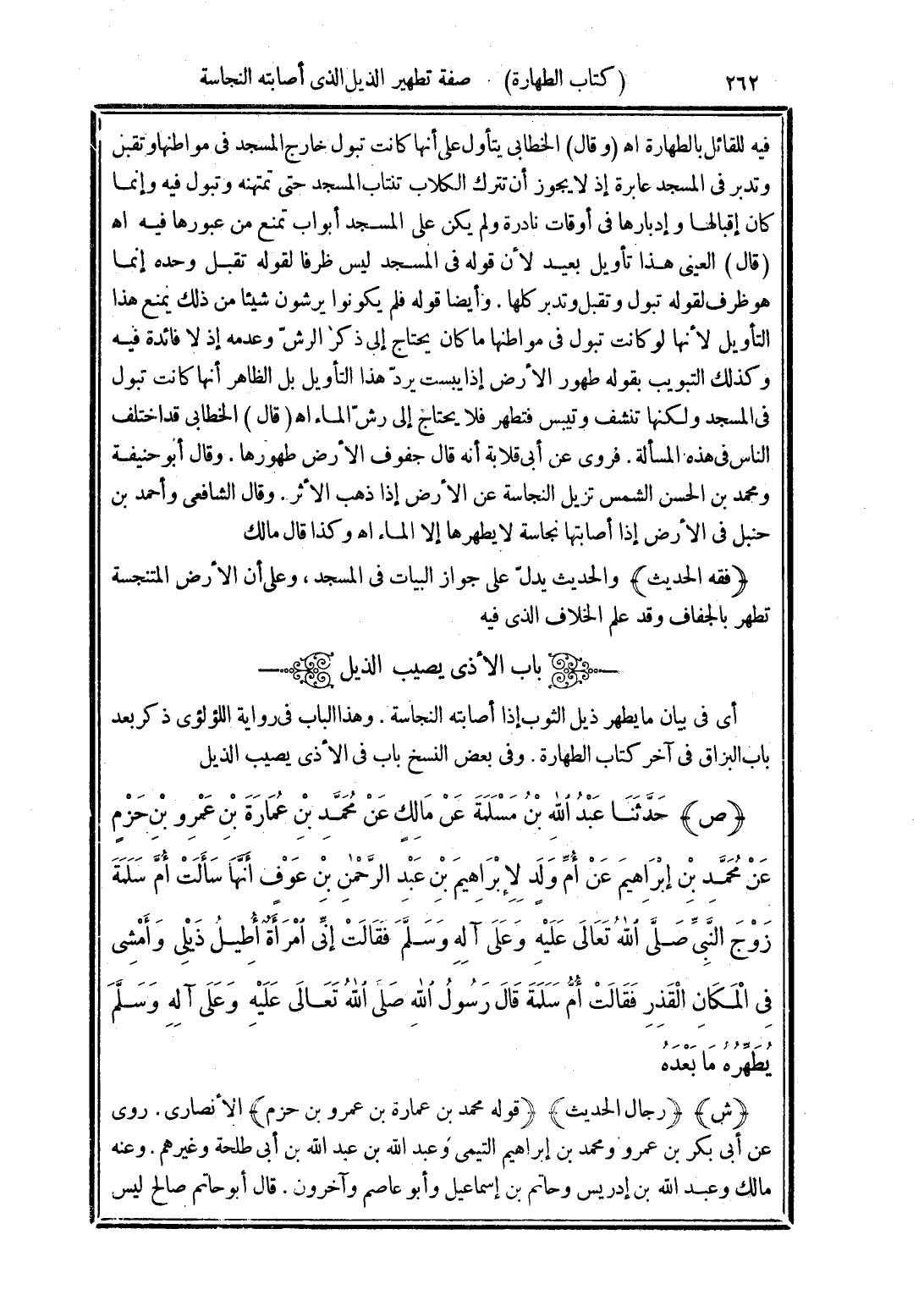 (ص) حَدَّثَنَا عَبْدُ اللَّهِ بْنُ مَسْلَمَةَ، عَنْ مَالِكٍ، عَنْ مُحَمَّدِ بْنِ عُمَارَةَ بْنِ عَمْرِو بْنِ حَزْمٍ، عَنْ مُحَمَّدِ بْنِ إِبْرَاهِيمَ، عَنْ أُمِّ وَلَدٍ لِإِبْرَاهِيمَ بْنِ عَبْدِ الرَّحْمَنِ بْنِ عَوْفٍ، أَنَّهَا سَأَلَتْ أُمَّ سَلَمَةَ زَوْجَ النَّبِيِّ صَلَّى اللهُ تَعَالَى عَلَيْهِ وَعَلَى آلِهِ وسَلَّمَ فَقَالَتْ: إِنِّي امْرَأَةٌ أُطِيلُ ذَيْلِي، وَأَمْشِي فِي الْمَكَانِ الْقَذِرِ فَقَالَتْ: أُمُّ سَلَمَةَ قَالَ رَسُولُ اللَّهِ صَلَّى اللهُ تَعَالَى عَلَيْهِ وَعَلَى آلِهِ وسَلَّمَ: «يُطَهِّرُهُ مَا بَعْدَهُ»