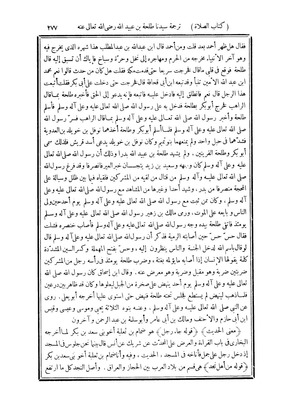 فقال هل ظهر أحمد بعد قلت ومن أحمد قال ابن عبد الله بن عبد المطلب هذا شهره الذى يخرج فيه وهو آخر الأنبياء مخرجه من الحرم ومهاجره إلى نخل وحرّة وسباخ فإياك أن تسبق إليه قال طلحة فوفع في قلبي ما قال فخرجت سريعا حتى قدمت مكة فقلت هل كان من حدث قالوا نعم محمد ابن عبد الله الأمين تنبأ وقد تبعه ابن أبى قحافة قال فخرجت حتى دخلت على أبى بكر فقلت أتبعت هذا الرجل قال نعم فانطلق إليه فادخل عليه فاتبعه فإنه يدعو إلى الحق فأخبره طلحة بما قال الراهب فخرج أبو بكر بطلحة فدخل به على رسول الله صلى الله تعالى عليه وعلى آله وسلم فأسلم طلحة وأخبر رسول الله صلى الله تعالى عليه وعلى آله وسلم بما قال الراهب فسرّ رسول الله صلى الله تعالى عليه وعلى آله وسلم فلما أسلم أبو بكر وطلحة أخذهما نوفل بن خويلد بن العدوية فشدّهما في حبل واحد ولم يمنعهما بنو تميم وكان نوفل بن خويلد يدعى أسد قريش فلذلك سمى أبو بكر وطلحة القرينين، ولم يشهد طلحة بن عبيد الله بدرا وذلك أن رسول الله صلى الله تعالى عليه وعلى آله وسلم كان وجَّهه وسعيد إبن زيد يتجسسان خبر العير فانصرفا وقد فرغ رسول الله صلى الله تعالى عليه وآله وسلم من قتال من لقيه من المشركين فلقياه فيما بين ظلل وسبالة على المحجة منصرفا من بدر، وشهد أحدا وغيرها من المشاهد مع رسول الله صلى الله تعالى عليه وعلى آله وسلم، وكان ممن ثبت مع رسول الله صلى الله تعالى عليه وعلى آله وسلم يوم أحد حين ولى الناس وبايعه على الموت، ورمى مالك بن زهير رسول الله صلى الله تعالى عليه وعلى آله وسلم يومئذ فاتقى طلحة بيده وجه رسول الله صلى الله تعالى عليه وعلى آله وسلم فأصاب خنصره فشلت فقال حسّ حسّ حين أصابته الرمية فذكر أن رسول الله صلى الله تعالى عليه وعلى آله وسلم قال لو قال بسم الله لدخل الجنة والناس ينظرون إليه "وحسّ بفتح المهملة وكسر السين المشدّدة كلمة يقولها الإنسان إذا أصابه ما يؤلمه بغتة" وضرب طلحة يومئذ في رأسه رجل من المشركين ضربتين ضربة وهو مقبل وضربة وهو معرض عنه، وقال ابن إسحاق كان رسول الله صلى الله تعالى عليه وعلى آله وسلم يوم أحد ينهض على صخرة من الجبل ليعلوها وكان قد ظاهر بين درعين فلما ذهب لينهض لم يستطع فجلس تحته طلحة فنهض حتى استوى عليها أخرجه أبو يعلى، روى عن النبى صلى الله تعالى عليه وعلى آله وسلم، وعنه بنوه الثلاثة يحيى وموسى وعيسى وقيس ابن أبى حازم والأحنف ومالك بن أبى عامر وأبو سلمة بن عبد الرحمن وآخرون