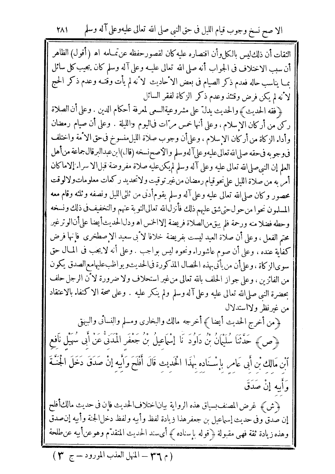 (فقه الحديث) والحديث يدلّ على مشروعية السعى لمعرفة أحكام الدين. وعلى أن الصلاة ركن من أركان الإسلام، وعلى أنها خمس مرّات في اليوم والليلة. وعلى أن صيام رمضان وأداء الزكاة من أركان الإسلام، وعلى أن وجوب صلاة الليل منسوخ في حق الأمة واختلف في وجوبه في حقه صلى الله تعالى عليه وعلى آله وسلم والأصح نسخه (قال) ابن عبد البر قال جماعة من أهل العلم إن النبى صلى الله تعالى عليه وعلى آله وسلم لم يكن عليه صلاة مفروضة قبل الإسراء إلا ما كان أمر به من صلاة الليل على نحو قيام رمضان من غير توقيت ولا تحديد ركعات معلومات ولا لوقت محصور وكان صلى الله تعالى عليه وعلى آله وسلم يقوم أدنى من ثلثى الليل ونصفه وثلثه وقام معه المسلمون نحوا من حول حتى شق عليهم ذلك فأنزل الله تعالى التوبة عنهم والتخفيف في ذلك ونسخه وحطه فضلا منه ورحمة فلم يبق من الصلاة فريضة إلا الخمس اهـ ودلّ الحديث أيضا على أن الوتر غير محتم الفعل، وعلى أن صلاة العيد ليست بفريضة خلافا لأبي سعيد الإصطخرى فإنها فرض كفاية عنده، وعلى أن صوم عاشوراء ونحوه ليس بواجب. وعلى أنه لا يجب في المال حق سوى الزكاة، وعلى أن من يأتى بهذه الخصال المذكورة في الحديث ويواظب عليها مع الصديق يكون من الفائزين، وعلى جواز الحلف بالله تعالى من غير استحلاف ولا ضرورة لأن الرجل حلف بحضرة النبى صلى الله تعالى عليه وعلى آله وسلم ولم ينكر عليه. وعلى صحة الاكتفاء بالاعتقاد من غير نظر ولا استدلال