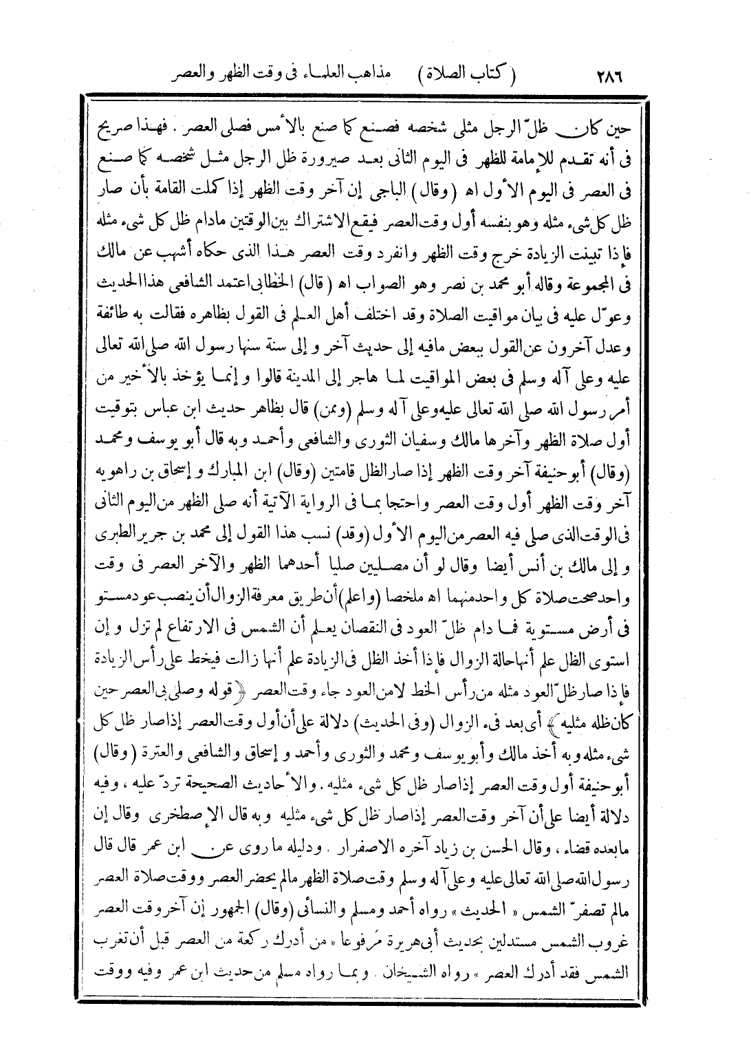 حين كان ظلّ الرجل مثلى شخصه فصنع كما صنع بالأمس فصلى العصر. فهذا صريح في أنه تقدم للإمامة للظهر في اليوم الثانى بعد صيرورة ظل الرجل مثل شخصه كما صنع في العصر في اليوم الأول اهـ (وقال) الباجى إن آخر وقت الظهر إذا كملت القامة بأن صار ظل كل شئ مثله وهو بنفسه أول وقت العصر فيقع الاشتراك بين الوقتين ما دام ظل كل شئ مثله فإذا تبينت الزيادة خرج وقت الظهر وانفرد وقت العصر هذا الذى حكاه أشهب عن مالك في المجموعة وقاله أبو محمد بن نصر وهو الصواب اهـ (قال) الخطابى اعتمد الشافعى هذا الحديث وعوّل عليه في بيان مواقيت الصلاة وقد اختلف أهل العلم في القول بظاهره فقالت به طائفة وعدل آخرون عن القول ببعض ما فيه إلى حديث آخر وإلى سنة سنها رسول الله صلى الله تعالى عليه وعلى آله وسلم في بعض المواقيت لما هاجر إلى المدينة قالوا وإنما يؤخذ بالأخير من أمر رسول الله صلى الله تعالى عليه وعلى آله وسلم (وممن) قال بظاهر حديث ابن عباس بتوقيت أول صلاة الظهر وآخرها مالك وسفيان الثورى والشافعى وأحمد وبه قال أبو يوسف ومحمد (وقال) أبو حنيفة آخر وقت الظهر إذا صار الظل قامتين (وقال) ابن المبارك وإسحاق بن راهويه آخر وقت الظهر أول وقت العصر واحتجا بما في الرواية الآتية أنه صلى الظهر من اليوم الثانى في الوقت الذى صلى فيه العصر من اليوم الأول (وقد) نسب هذا القول إلى محمد بن جرير الطبرى وإلى مالك بن أنس أيضا وقال لو أن مصليين صليا أحدهما الظهر والآخر العصر في وقت واحد صحت صلاة كل واحد منهما اهـ ملخصا (واعلم) أن طريق معرفة الزوال أن ينصب عود مستو في أرض مستوية فما دام ظلّ العود في النقصان يعلم أن الشمس في الارتفاع لم تزل وإن استوى الظل علم أنها حالة الزوال فإذا أخذ الظل في الزيادة علم أنها زالت فيخط على رأس الزيادة فإذا صار ظلّ العود مثله من رأس الخط لا من العود جاء وقت العصر
