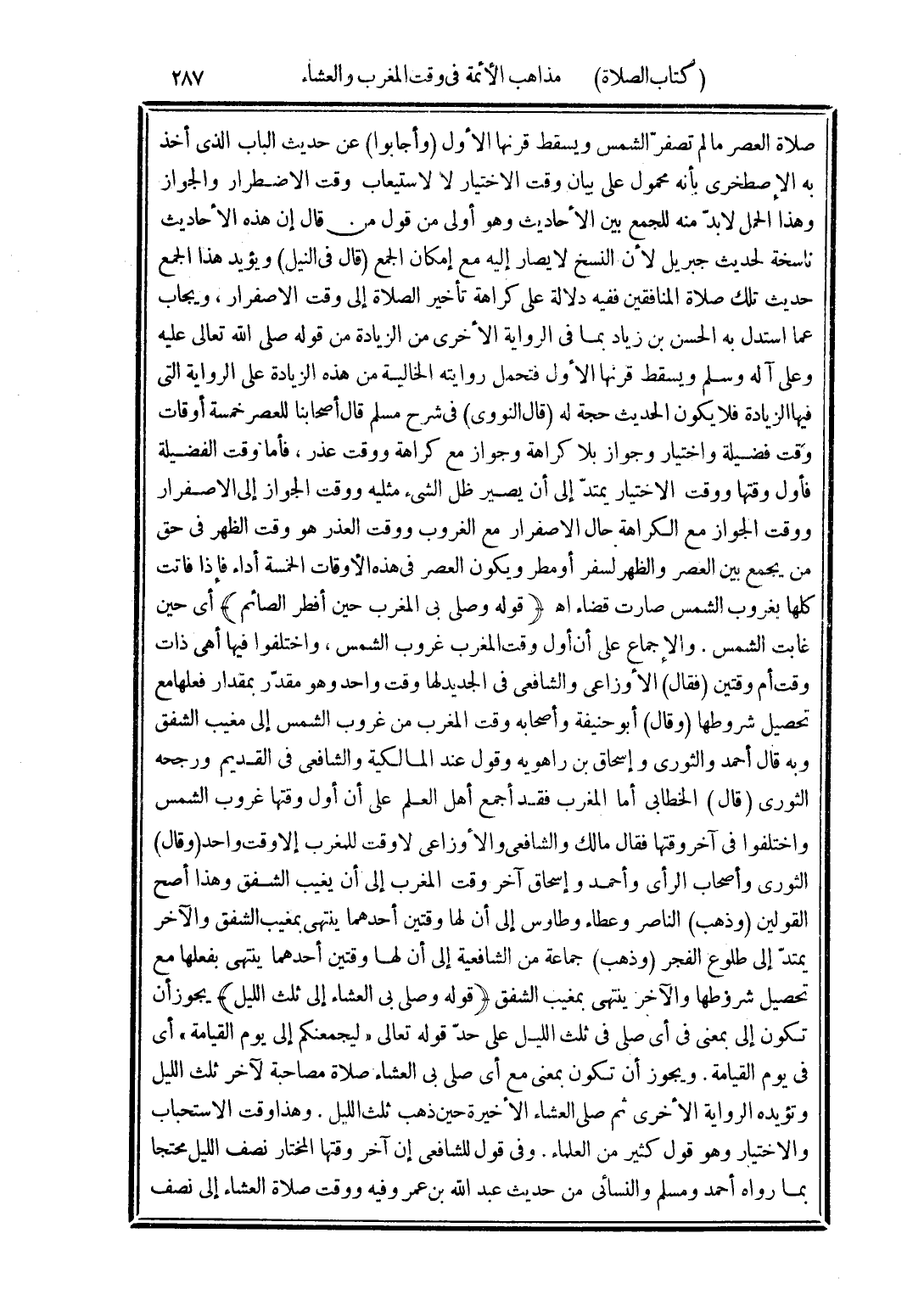صلاة العصر ما لم تصفرّ الشمس ويسقط قرنها الأول (وأجابوا) عن حديث الباب الذى أخذ به الإصطخرى بأنه محمول على بيان وقت الاختيار لا لاستيعاب وقت الاضطرار والجواز وهذا الحمل لا بدّ منه للجمع بين الأحاديث وهو أولى من قول من قال إن هذه الأحاديث ناسخة لحديث جبريل لأن النسخ لا يصار إليه مع إمكان الجمع (قال في النيل) ويؤيد هذا الجمع حديث تلك صلاة المنافقين ففيه دلالة على كراهة تأخير الصلاة إلى وقت الاصفرار، ويجاب عما استدل به الحسن بن زياد بما في الرواية الأخرى من الزيادة من قوله صلى الله تعالى عليه وعلى آله وسلم ويسقط قرنها الأول فتحمل روايته الخالية من هذه الزيادة على الرواية التى فيها الزيادة فلا يكون الحديث حجة له (قال النووى) في شرح مسلم قال أصحابنا للعصر خمسة أوقات وقت فضيلة واختيار وجواز بلا كراهة وجواز مع كراهة ووقت عذر، فأما وقت الفضيلة فأول وقتها ووقت الاختيار يمتدّ إلى أن يصير ظل الشئ مثليه ووقت الجواز إلى الاصفرار ووقت الجواز مع الكراهة حال الاصفرار مع الغروب ووقت العذر هو وقت الظهر في حق من يجمع بين العصر والظهر لسفر أو مطر ويكون العصر في هذه الأوقات الخمسة أداء فإذا فاتت كلها بغروب الشمس صارت قضاء اهـ