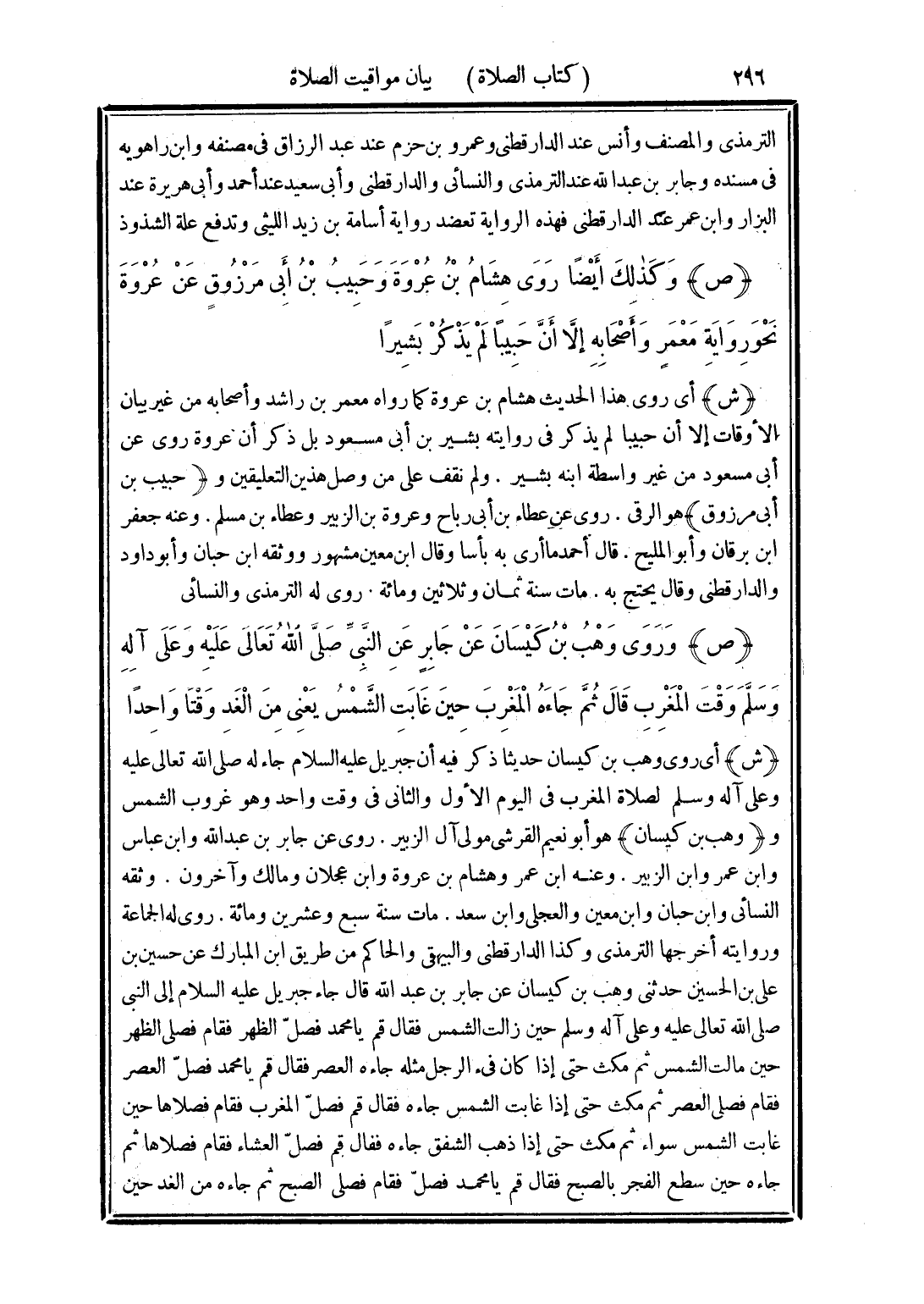 (ص) وَرَوَى وَهْبُ بْنُ كَيْسَانَ، عَنْ جَابِرٍ، عَنِ النَّبِيِّ صَلَّى اللهُ تَعَالَى عَلَيْهِ وَسَلَّمَ وَقْتَ الْمَغْرِبِ قَالَ: «ثُمَّ جَاءَهُ الْمَغْرِبِ حِينَ غَابَتِ الشَّمْسُ يَعْنِي مِنَ الْغَدِ وَقْتًا وَاحِدًا».