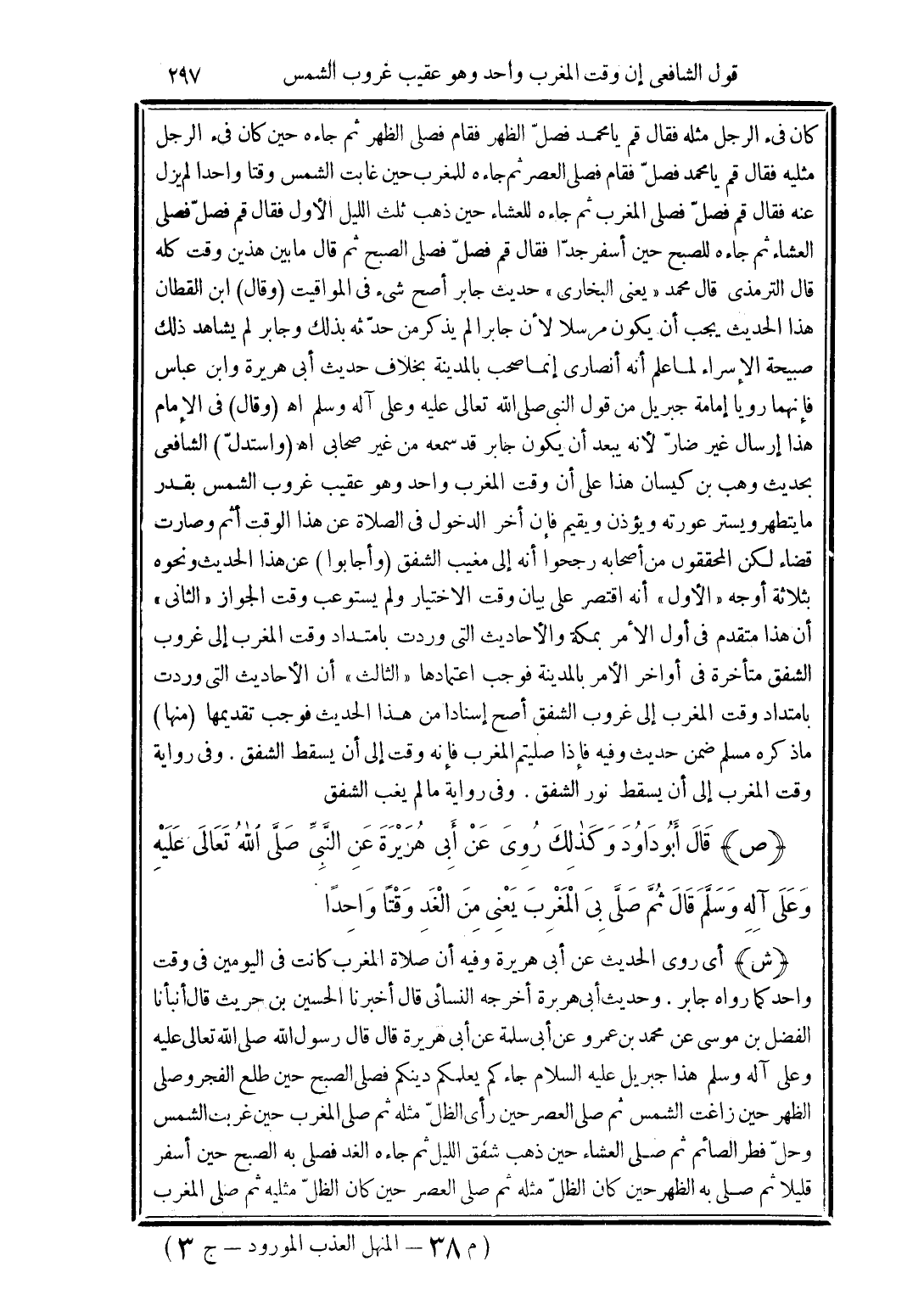 كان فئ الرجل مثله فقال قم يا محمد فصلّ الظهر فقام فصلى الظهر ثم جاءه حين كان فئ الرجل مثليه فقال قم يا محمد فصلّ فقام فصلى العصر ثم جاءه للمغرب حين غابت الشمس وقتا واحدا لم يزل عنه فقال قم فصلّ فصلى المغرب ثم جاءه للعشاء حين ذهب ثلث الليل الأول فقال قم فصلّ فصلى العشاء ثم جاءه للصبح حين أسفر جدّا فقال قم فصلّ فصلى الصبح ثم قال ما بين هذين وقت كله قال الترمذى قال محمد "يعنى البخارى" حديث جابر أصح شيء في المواقيت (وقال) ابن القطان هذا الحديث يجب أن يكون مرسلا لأن جابرا لم يذكر من حدّثه بذك وجابر لم يشاهد ذلك صبيحة الإسراء لما علم أنه أنصارى إنما صحب بالمدينة بخلاف حديث أبى هريرة وابن عباس فإنهما رويا إمامة جبريل من قول النبي صلى الله تعالى عليه وعلى آله وسلم اهـ (وقال) في الإمام هذا إرسال غير ضارّ لأنه يبعد أن يكون جابر قد سمعه من غير صحابي اهـ (واستدلّ) الشافعى بحديث وهب بن كيسان هذا على أن وقت المغرب واحد وهو عقيب غروب الشمس بقدر ما يتطهر ويستر عورته ويؤذن ويقيم فإن أخر الدخول في الصلاة عن هذا الوقت أثم وصارت قضاء لكن المحققون من أصحابه رجحوا أنه إلى مغيب الشفق (وأجابوا) عن هذا الحديث ونحوه بثلاثة أوجه "الأول" أنه اقتصر على بيان وقت الاختيار ولم يستوعب وقت الجواز "الثاني" أن هذا متقدم في أول الأمر بمكة والأحاديث التى وردت بامتداد وقت المغرب إلى غروب الشفق متأخرّة في أواخر الأمر بالمدينة فوجب اعتمادها "الثالث" أن الأحاديث التى وردت بامتداد وقت المغرب إلى غروب الشفق أصح إسنادا من هذا الحديث فوجب تقديمها (منها) ما ذكره مسلم ضمن حديث وفيه فإذا صليتم المغرب فإنه وقت إلى أن يسقط الشفق. وفى رواية وقت المغرب إلى أن يسقط نور الشفق. وفى رواية ما لم يغب الشفق