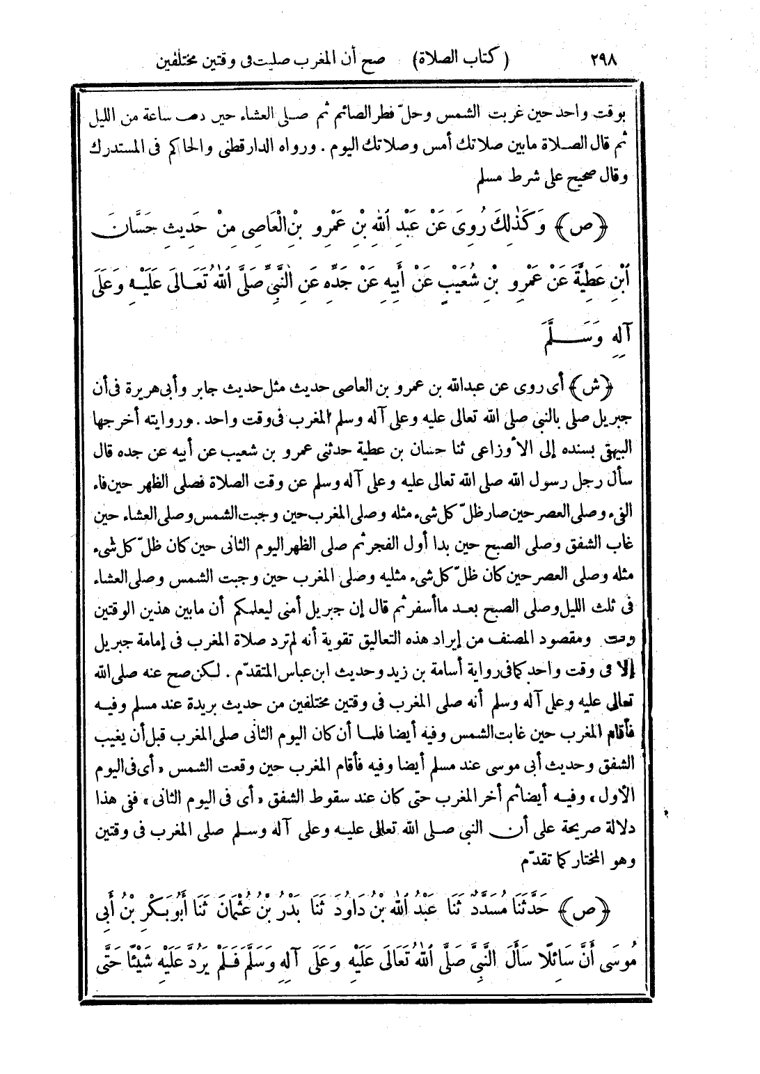 (ش) أى روى عن عبد الله بن عمرو بن العاصى حديث مثل حديث جابر وأبى هريرة في أن جبريل صلى بالنبي صلى الله تعالى عليه وعلى آله وسلم المغرب في وقت واحد. وروايته أخرجها البيهقي بسنده إلى الأوزاعي ثنا حسان بن عطية حدثنى عمرو بن شعيب عن أبيه عن جده قال سأل رجل رسول الله صلى الله تعالى عليه وعلى آله وسلم عن وقت الصلاة فصلى الظهر حين فاء الفئ وصلى العصر حين صار ظلّ كل شيء مثله وصلى المغرب حين وجبت الشمس وصلى العشاء حين غاب الشفق وصلى الصبح حين بدا أول الفجر ثم صلى الظهر اليوم الثانى حين كان ظلّ كل شئ مثله وصلى العصر حين كان ظلّ كل شئ مثليه وصلى المغرب حين وجبت الشمس وصلى العشاء في ثلث الليل وصلى الصبح بعد ما أسفر ثم قال إن جبريل أمَّني ليعلمكم أن ما بين هذين الوقتين وقت ومقصود المصنف من إيراد هذه التعاليق تقوية أنه لم ترد صلاة المغرب في إمامة جبريل إلا في وقت واحد كما في رواية أسامة بن زيد وحديث ابن عباس المتقدّم. لكن صح عنه صلى الله تعالى عليه وعلى آله وسلم أنه صلى المغرب في وقتين مختلفين من حديث بريدة عند مسلم وفيه فأقام المغرب حين غابت الشمس وفية أيضا فلما أن كان اليوم الثاني صلى المغرب قبل أن يغيب الشفق وحديث أبى موسى عند مسلم أيضا وفيه فأقام المغرب حين وقعت الشمس "أى في اليوم الأول" وفيه أيضا ثم أخر المغرب حتى كان عند سقوط الشفق "أى في اليوم الثاني" ففى هذا دلالة صريحة على أن النبى صلى الله تعالى عليه وعلى آله وسلم صلى المغرب في وقتين وهو المختار كما تقدّم