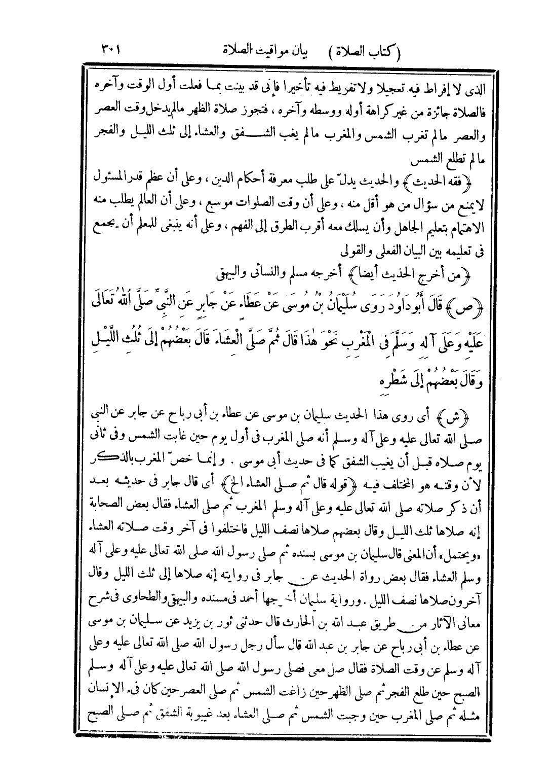 (ش) أى روى هذا الحديث سليمان بن موسى عن عطاء بن أبى رباح عن جابر عن النبى صلى الله تعالى عليه وعلى آله وسلم أنه صلى المغرب في أول يوم حين غابت الشمس وفي ثاني يوم صلاه قبل أن يغيب الشفق كما في حديث أبى موسى. وإنما خصّ المغرب بالذكر لأن وقته هو المختلف فيه