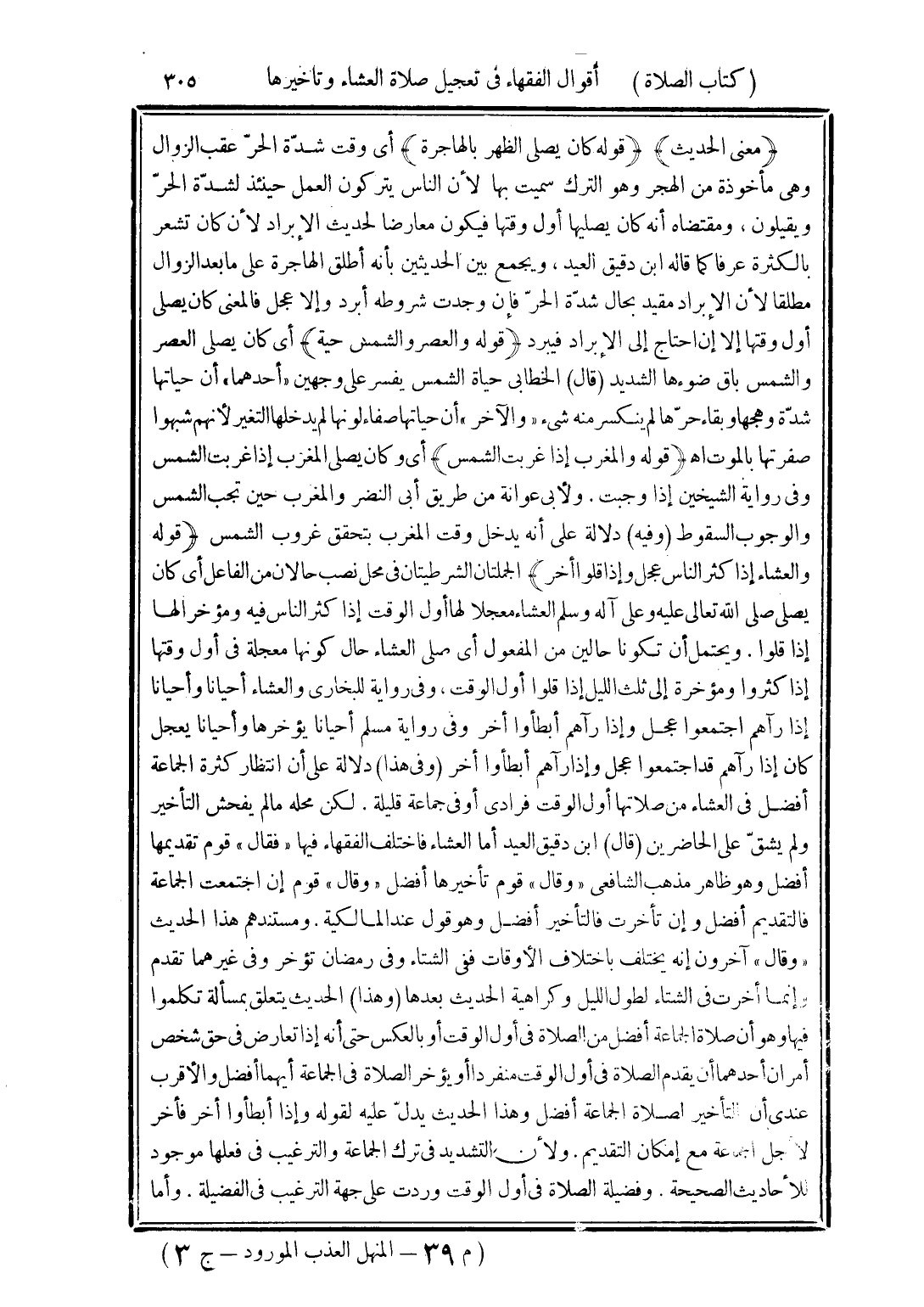 (قوله والعشاء إذا كثر الناس عجل وإذا قلوا أخر) الجملتان الشرطيتان في محل نصب حالان من الفاعل أى كان يصلى صلى الله تعالى عليه وعلى آله وسلم العشاء معجلا لها أول الوقت إذا كثر الناس فيه ومؤخرا لها إذا قلوا. ويحتمل أن تكونا حالين من المفعول أى صلى العشاء حال كونها معجلة في أول وقتها إذا كثروا ومؤخرة إلى ثلث الليل إذا قلوا أول الوقت، وفى رواية للبخارى والعشاء أحيانا واحيانا إذا رآهم اجتمعوا عجل وإذا رآهم أبطأوا أخر وفى رواية مسلم أحيانا يؤخرها وأحيانا يعجل كان إذا رآهم قد اجتمعوا عجل وإذا رآهم أبطأوا أخر (وفى هذا) دلالة على أن انتظار كثرة الجماعة أفضل في العشاء من صلاتها أول الوقت فرادى أو في جماعة قليلة. لكن محله ما لم يفحش التأخير ولم يشقّ على الحاضرين (قال) ابن دقيق العيد أما العشاء فاختلف الفقهاء فيها "فقال" قوم تقديمها أفضل وهو ظاهر مذهب الشافعى "وقال" قوم تأخيرها أفضل "وقال" قوم إن اجتمعت الجماعة فالتقديم أفضل وإن تأخرت فالتأخير أفضل وهو قول عند المالكية. ومستندهم هذا الحديث "وقال" آخرون إنه يختلف باختلاف الأوقات ففى الشتاء وفى رمضان تؤخر وفى غيرهما تقدم وإنما أخرّت في الشتاء لطول الليل وكراهية الحديث بعدها (وهذا) الحديث يتعلق بمسألة تكلموا فيها وهو أن صلاة الجماعة أفضل من الصلاة في أول الوقت أو بالعكس حتى أنه إذا تعارض في حق شخص أمران أحدهما أن يقدم الصلاة في أول الوقت منفردا أو يؤخر الصلاة في الجماعة أيهما أفضل والأقرب عندى أن التأخير لصلاة الجماعة أفضل وهذا الحديث يدلّ عليه لقوله وإذا أبطأوا أخر فأخر لأجل الجماعة مع إمكان التقديم. ولأن التشديد في ترك الجماعة والترغيب في فعلها موجود للأحاديث الصحيحة. وفضيلة الصلاة في أول الوقت وردت على جهة الترغيب في الفضيلة. وأما