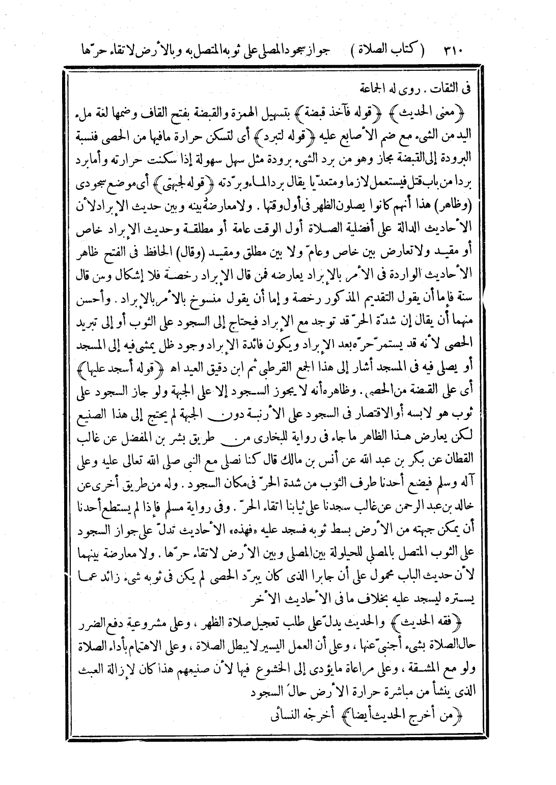 (فقه الحديث) والحديث يدلّ على طلب تعجيل صلاة الظهر، وعلى مشروعية دفع الضرر حال الصلاة بشئ أجنبيّ عنها، وعلى أن العمل اليسير لا يبطل الصلاة، وعلى الاهتمام بأداء الصلاة ولو مع المشقة، وعلى مراعاة ما يؤدى إلى الخشوع فيها لأن صنيعهم هذا كان لإزالة العبث الذى ينشأ من مباشرة حرارة الأرض حال السجود
