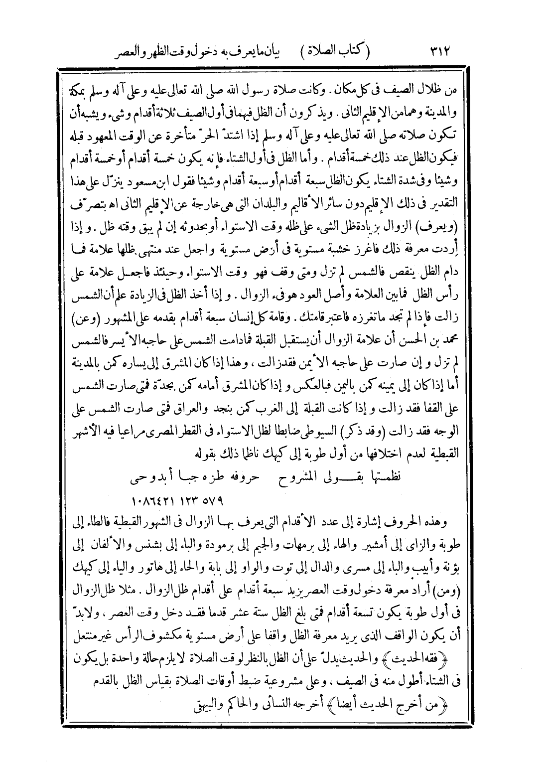 وهذه الحروف إشارة إلى عدد الأقدام التى يعرف بها الزوال في الشهور القبطية فالطاء إلى طوبة والزاى إلى أمشير والهاء إلى برمهات والجيم إلى برمودة والباء إلى بشنس والألفان إلى بؤنة وأبيب والباء إلى مسرى والدال إلى توت والواو إلى بابة والحاء إلى هاتور والياء إلى كيهك (ومن) أراد معرفة دخول وقت العصر يزيد سبعة أقدام على أقدام ظل الزوال. مثلا ظل الزوال في أول طوبة يكون تسعة أقدام فمتى بلغ الظل ستة عشر قدما فقد دخل وقت العصر، ولا بدّ أن يكون الواقف الذى يريد معرفة الظل واقفا على أرض مستوية مكشوف الرأس غير منتعل