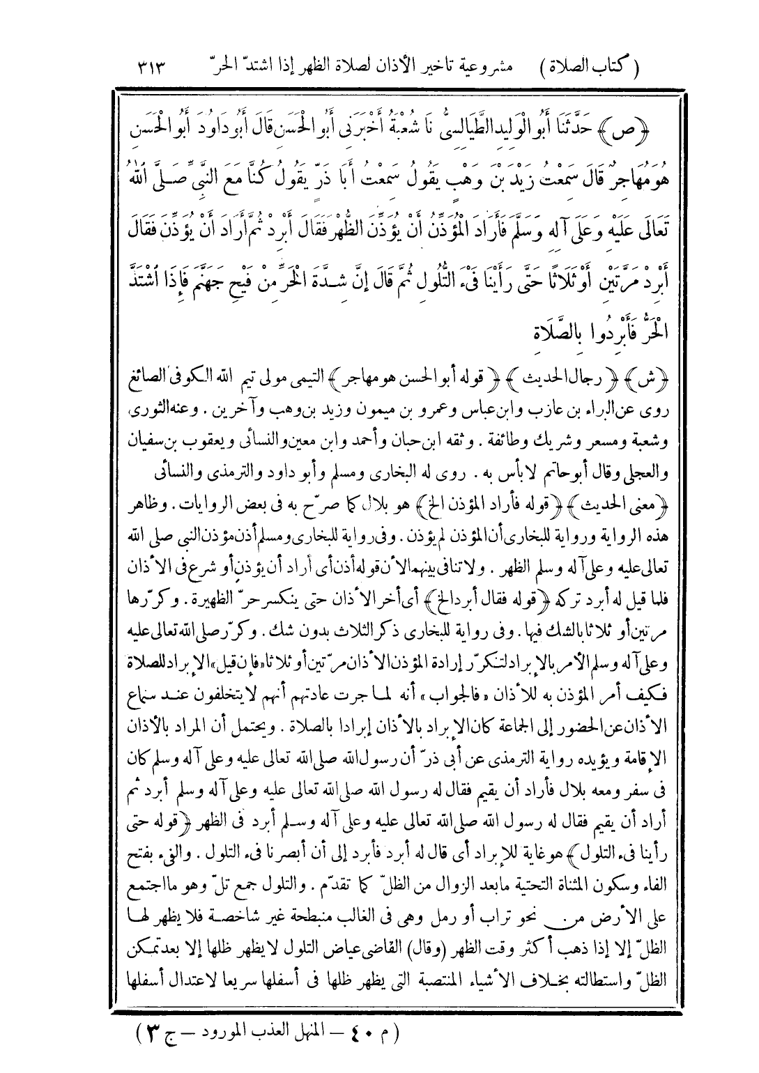 (ص) حَدَّثَنَا أَبُو الْوَلِيدِ الطَّيَالِسِيُّ، نَا شُعْبَةُ، أَخْبَرَنِي أَبُو الْحَسَنِ قَالَ: أَبُو دَاوُدَ أَبُو الْحَسَنِ هُوَ مُهَاجِرٌ، قَالَ: سَمِعْتُ زَيْدَ بْنَ وَهْبٍ يَقُولُ: سَمِعْتُ أَبَا ذَرٍّ يَقُولُ: كُنَّا مَعَ النَّبِيِّ صَلَّى اللهُ تَعَالَى عَلَيْهِ وَعَلَى آلِهِ وَسَلَّمَ، فَأَرَادَ الْمُؤَذِّنُ أَنْ يُؤَذِّنَ الظُّهْرَ فَقَالَ: «أَبْرِدْ». ثُمَّ أَرَادَ أَنْ يُؤَذِّنَ فَقَالَ: «أَبْرِدْ» -مَرَّتَيْنِ أَوْ ثَلَاثًا- حَتَّى رَأَيْنَا فَيْءَ التُّلُولِ، ثُمَّ قَالَ: «إِنَّ شِدَّةَ الْحَرِّ مِنْ فَيْحِ جَهَنَّمَ، فَإِذَا اشْتَدَّ الْحَرُّ فَأَبْرِدُوا بِالصَّلَاةِ»