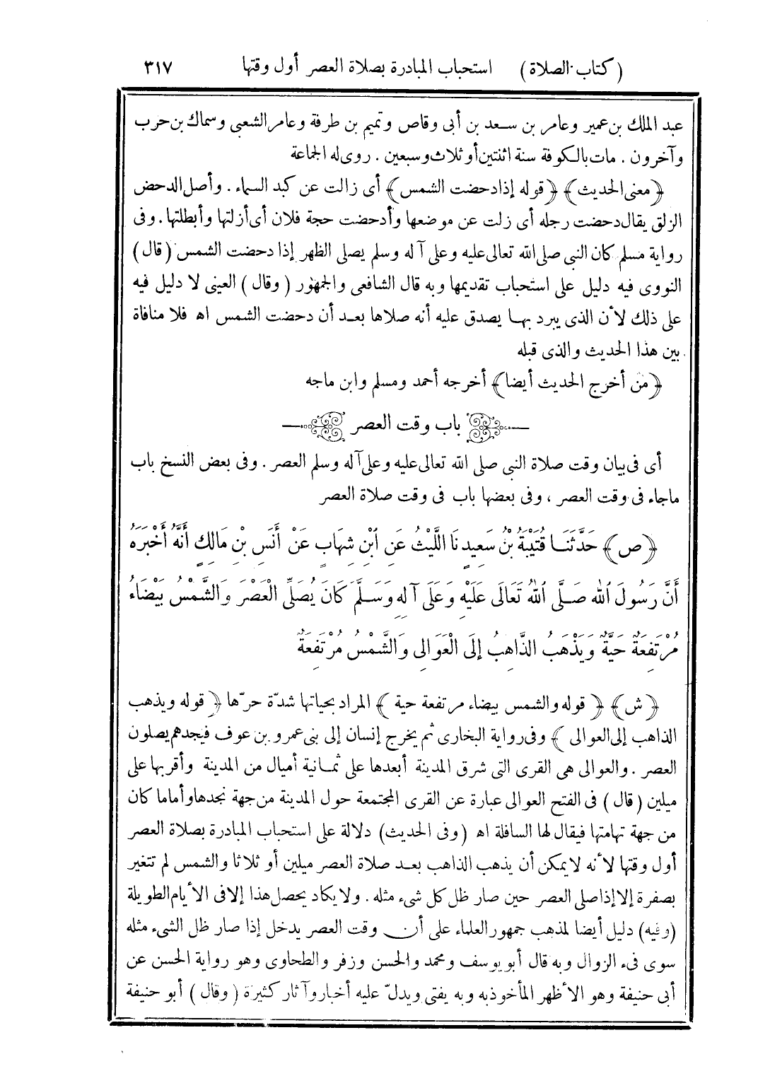 (ص) حَدَّثَنَا قُتَيْبَةُ بْنُ سَعِيدٍ، نَا اللَّيْثُ، عَنِ ابْنِ شِهَابٍ، عَنْ أَنَسِ بْنِ مَالِكٍ أَنَّهُ أَخْبَرَهُ، «أَنَّ رَسُولَ اللَّهِ صَلَّى اللهُ تَعَالَى عَلَيْهِ وَعَلَى آلِهِ وسَلَّمَ كَانَ يُصَلِّي الْعَصْرَ وَالشَّمْسُ بَيْضَاءُ مُرْتَفِعَةٌ حَيَّةٌ» وَيَذْهَبُ الذَّاهِبُ إِلَى الْعَوَالِي وَالشَّمْسُ مُرْتَفِعَةٌ.