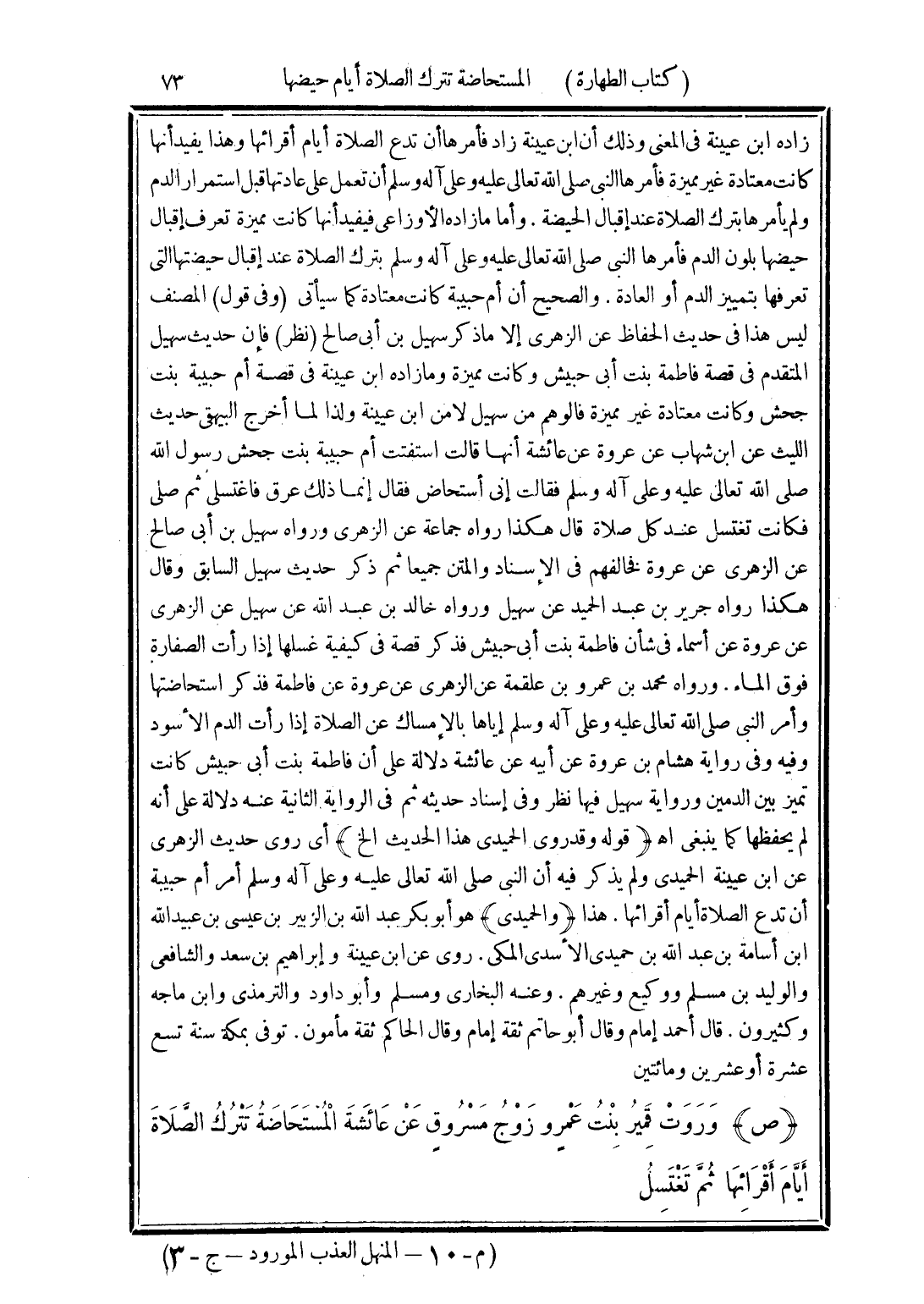 زاده ابن عيينة في المعنى وذلك أن ابن عيينة زاد فأمرها أن تدع الصلاة أيام أقرائها وهذا يفيد أنها كانت معتادة غير مميزة فأمرها النبي صلى الله تعالى عليه وعلى له وسلم أن تعمل على عادتها قبل استمرار الدم ولم يأمرها بترك الصلاة عند إقبال الحيضة. وأما ما زاده الأوزاعى فيفيد أنها كانت مميزة تعرف إقبال حيضها بدون الدم فأمرها النبي صلى الله تعالى عليه وعلى آله وسلم بترك الصلاة عند إقبال حيضتها التى تعرفها بتمييز الدم أو العادة. والصحيح أن أم حبيبة كانت معتادة كما سيأتى (وفى قول) المصنف ليس هذا في حديث الحفاظ عن الزهرى إلا ما ذكر سهيل بن أبى صالح (نظر) فإن حديث سهيل المتقدم في قصة فاطمة بنت أبى حبيش وكانت مميزة وما زاده ابن عيينة في قصة أم حبيبة بنت جحش وكانت معتادة غير مميزة فالوهم من سهيل لا من ابن عيينة ولذا لما أخرح البيهقى حديث الليث عن ابن شهاب عن عروة عن عائشة أنها قالت استفتت أم حبيبة بنت جحش رسول الله صلى الله تعالى عليه وعلى آله وسلم فقالت إني أستحاض فقال إنما ذلك عرق فاغتسلى ثم صلى فكانت تغتسل عند كل صلاة قال هكذا رواه جماعة عن الزهرى ورواه سهيل بن أبى صالح عن الزهرى عن عروة فخالفهم في الإسناد والمتن جميعا ثم ذكر حديث سهيل السابق وقال هكذا رواه جرير بن عبد الحميد عن سهيل ورواه خالد بن عبد الله عن سهيل عن الزهرى عن عروة عن أسماء في شأن فاطمة بنت أبى حبيش فذكر قصة في كيفية غسلها إذا رأت الصفارة فوق الماء. ورواه محمد بن عمرو بن علقمة عن الزهرى عن عروة عن فاطمة فذكر استحاضتها وأمر النبى صلى الله تعالى عليه وعلى آله وسلم إياها بالإمساك عن الصلاة إذا رأت الدم الأسود وفيه وفي رواية هشام بن عروة عن أبيه عن عائشة دلالة على أن فاطمة بنت أبى حبيش كانت تميز بين الدمين ورواية سهيل فيها نظر وفى إسناد حديثه ثم في الرواية الثانية عنه دلالة على أنه لم يحفظها كما ينبغى اهـ