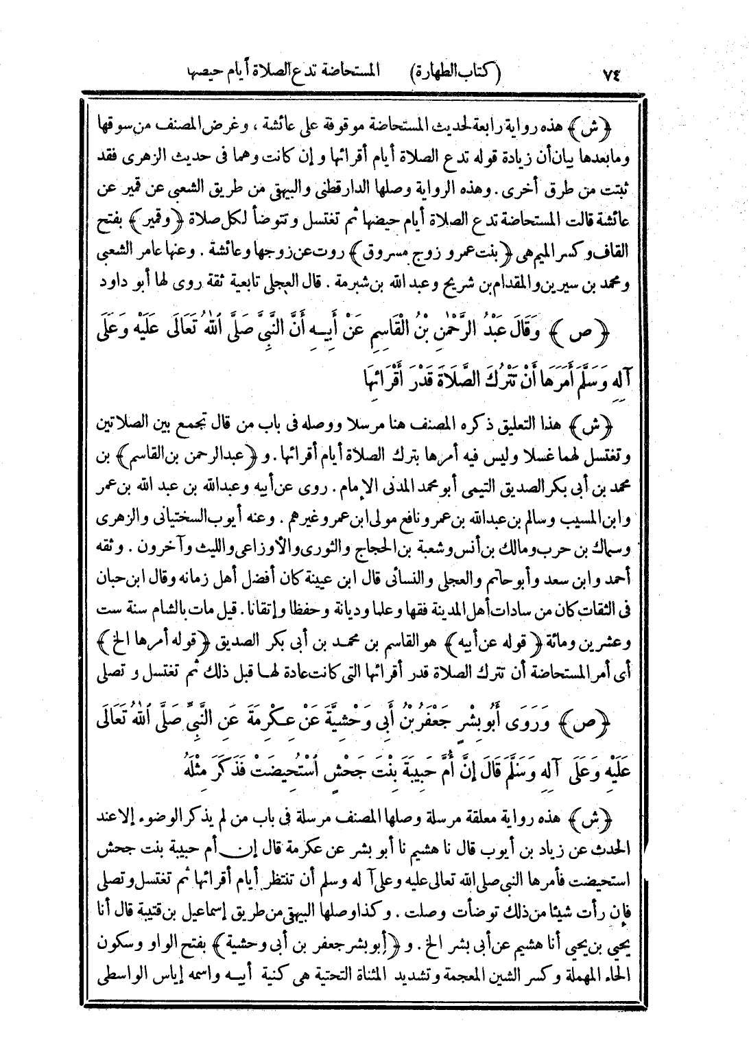 (ص) وَقَالَ عَبْدُ الرَّحْمَنِ بْنُ الْقَاسِمِ، عَنْ أَبِيهِ، إِنَّ النَّبِيَّ صَلَّى اللهُ تَعَالَى عَلَيْهِ وَسَلَّمَ «أَمَرَهَا أَنْ تَتْرُكَ الصَّلَاةَ قَدْرَ أَقْرَائِهَا»