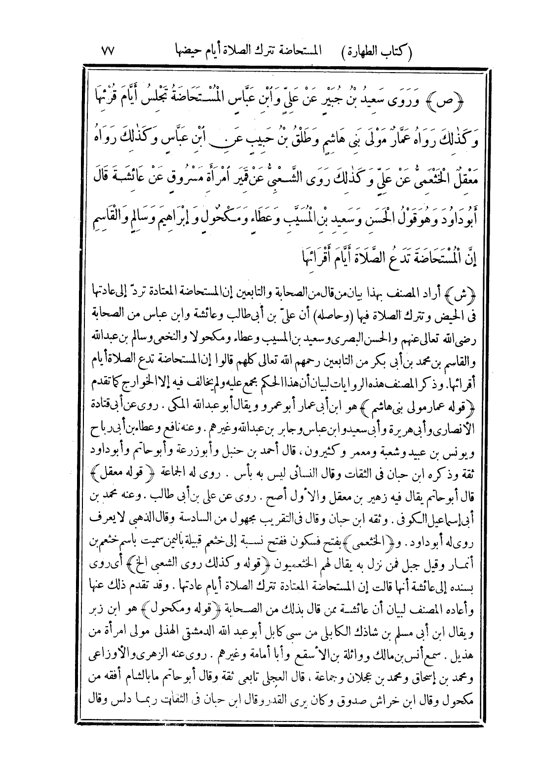 (ص) وَرَوَى سَعِيدُ بْنُ جُبَيْرٍ، عَنْ عَلِيٍّ، وَابْنِ عَبَّاسٍ «الْمُسْتَحَاضَةُ تَجْلِسُ أَيَّامَ قُرْئِهَا» وَكَذَلِكَ رَوَاهُ عَمَّارٌ مَوْلَى بَنِي هَاشِمٍ، وَطَلْقُ بْنُ حَبِيبٍ، عَنِ ابْنِ عَبَّاسٍ، وَكَذَلِكَ رَوَاهُ مَعْقِلٌ الْخَثْعَمِيُّ، عَنْ عَلِيٍّ رَضِيَ اللَّهُ تَعَالَى عَنْهُ وَكَذَلِكَ رَوَى الشَّعْبِيُّ، عَنْ قَمِيرَ امْرَأَة مَسْرُوقٍ، عَنْ عَائِشَةَ رَضِيَ اللَّهُ عَنْهَا. قَالَ أَبُو دَاوُدَ: وَهُوَ قَوْل الْحَسَنِ، وَسَعِيدِ بْنِ الْمُسَيِّبِ، وَعَطَاءٍ، وَمَكْحُولٍ، وَإِبْرَاهِيمَ، وَسَالِمٍ، وَالْقَاسِمِ، «أَنَّ الْمُسْتَحَاضَةَ تَدَعُ الصَّلَاةَ أَيَّامَ أَقْرَائِهَا»
