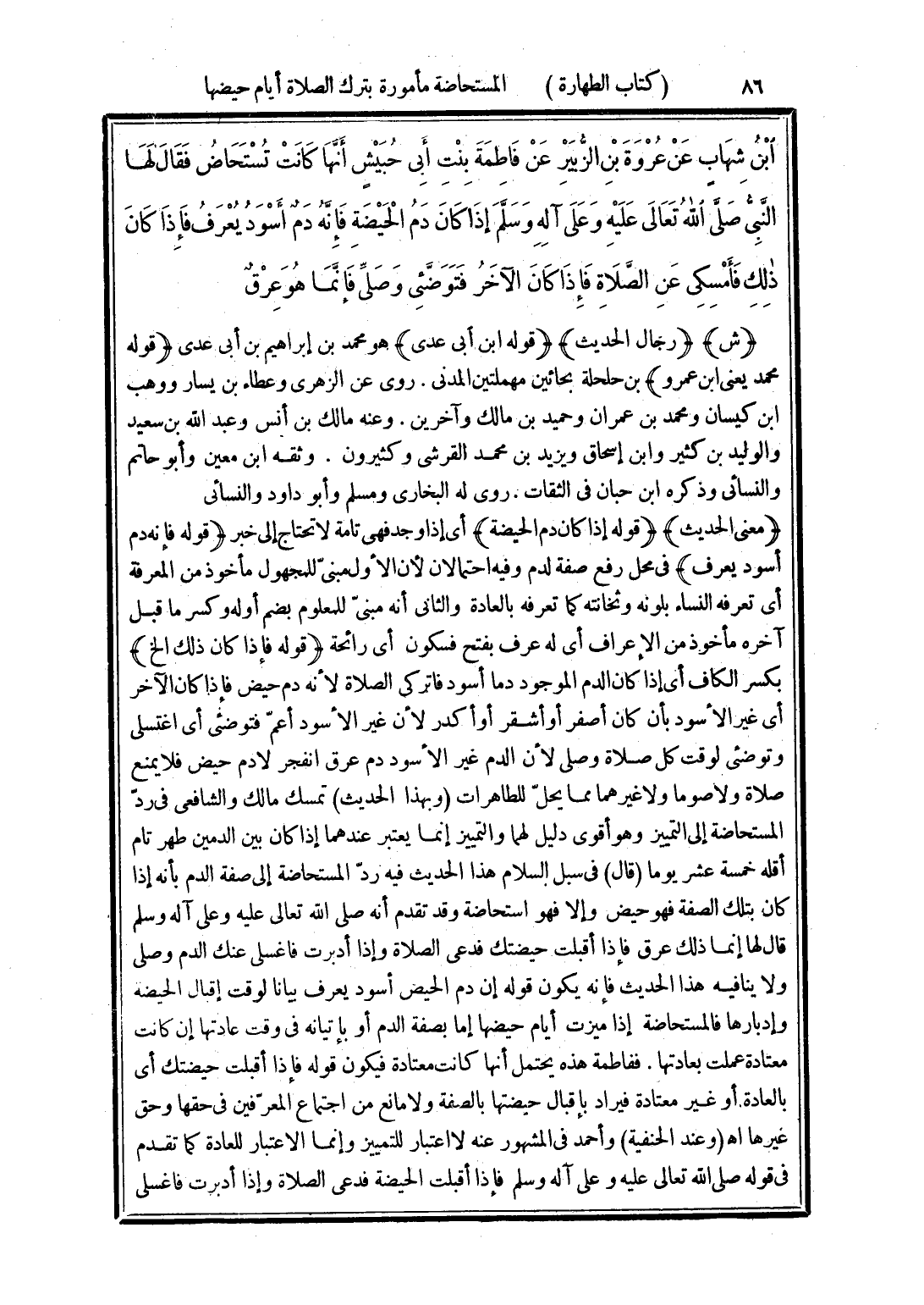 ابْنُ شِهَابٍ، عَنْ عُرْوَةَ بْنِ الزُّبَيْرِ، عَنْ فَاطِمَةَ بِنْتِ أَبِي حُبَيْشٍ أَنَّهَا كَانَتْ تُسْتَحَاضُ، فَقَالَ لَهَا النَّبِيُّ صَلَّى اللهُ تَعَالَى عَلَيْهِ وَعَلَى آلِهِ وسَلَّمَ: «إِذَا كَانَ دَمُ الْحَيْضَةِ فَإِنَّهُ دم أَسْوَدُ يُعْرَفُ، فَإِذَا كَانَ ذَلِكَ فَأَمْسِكِي عَنِ الصَّلَاةِ، فَإِذَا كَانَ الْآخَرُ فَتَوَضَّئِي وَصَلِّي فَإِنَّمَا هُوَ عِرْقٌ»