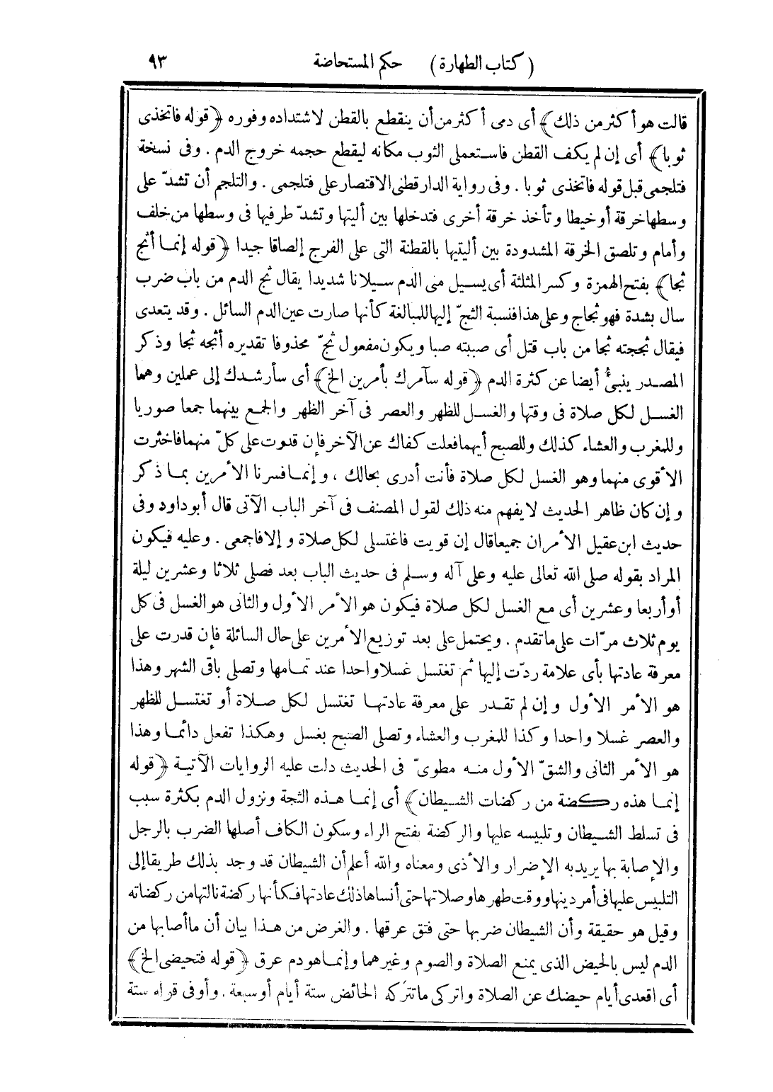 (قوله سآمرك بأمرين الخ) أى سأرشدك إلى عملين وهما الغسل لكل صلاة في وقتها والغسل للظهر والعصر في آخر الظهر والجمع بينهما جمعا صوريا وللمغرب والعشاء كذك وللصبح أيهما فعلت كفاك عن الآخر فإن قدرت على كلّ منهما فاخثرت الأقوى منهما وهو الغسل لكل صلاة فأنت أدرى بحالك، وإنما فسرنا الأمرين بما ذكر وإن كان ظاهر الحديث لا يفهم منه ذلك لقول المصنف في آخر الباب الآتى قال أبو داود وفى حديث ابن عقيل الأمران جميعا قال إن قويت فاغتسلى لكل صلاة وإلا فاجمعى. وعليه فيكون المراد بقوله صلى الله تعالى عليه وعلى آله وسلم في حديث الباب بعد فصلى ثلاثا وعشرين ليلة أو أربعا وعشرين أى مع الغسل لكل صلاة فيكون هو الأمر الأول والثانى هو الغسل في كل يوم ثلاث مرّات على ما تقدم. ويحتمل على بعد توزيع الأمرين على حال السائلة فإن قدرت على معرفة عادتها بأى علامة ردّت إليها ثم تغتسل غسلا واحدا عند تمامها وتصلى باقى الشهر وهذا هو الأمر الأول وإن لم تقدر على معرفة عادتها تغتسل لكل صلاة أو تغتسل للظهر والعصر غسلا واحدا وكذا للمغرب والعشاء وتصلى الصبح بغسل وهكذا تفعل دائما وهذا هو الأمر الثانى والشقّ الأول منه مطوىّ في الحديث دلت عليه الروايات الآتية