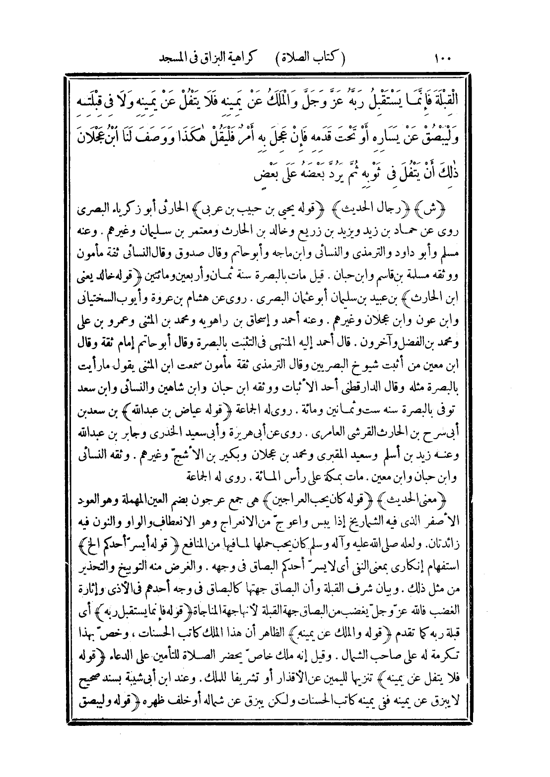 الْقِبْلَةَ فَإِنَّمَا يَسْتَقْبِلُ رَبَّهُ عَزَّ وَجَلَّ، وَالْمَلَكُ عَنْ يَمِينِهِ، فَلَا يَتْفُلْ عَنْ يَمِينِهِ، وَلَا فِي قِبْلَتِهِ، وَلْيَبْصُقْ عَنْ يَسَارِهِ، أَوْ تَحْتَ قَدَمِهِ، فَإِنْ عَجِلَ بِهِ أَمْرٌ فَلْيَقُلْ هَكَذَا» وَوَصَفَ لَنَا ابْنُ عَجْلَانَ ذَلِكَ أَنْ يَتْفُلَ فِي ثَوْبِهِ، ثُمَّ يَرُدَّ بَعْضَهُ عَلَى بَعْضٍ
