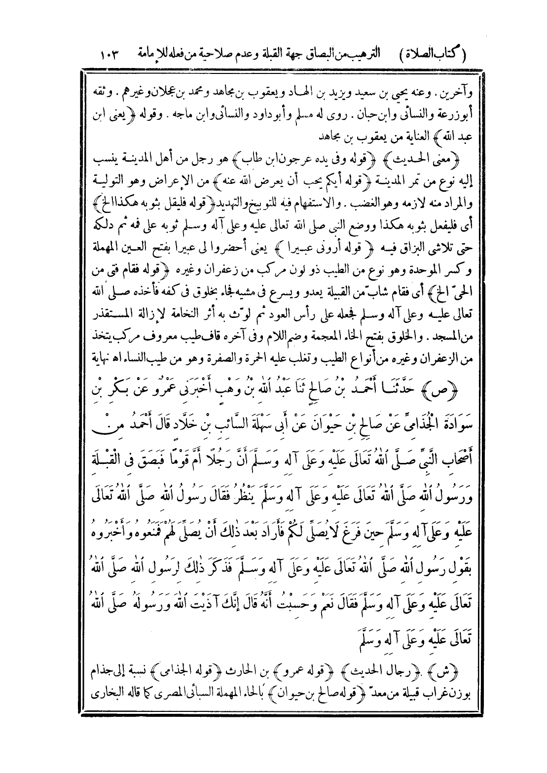 (قوله فقام فتى من الحيّ الخ) أى فقام شابّ من القبيلة يعدو ويسرع في مشيه فجاء بخلوق في كفه فأخذه صلى الله تعالى عليه وعلى آله وسلم فجعله على رأس العود ثم لوّث به أثر النخامة لإزالة المستقذر من المسجد. والخلوق بفتح الخاء المعجمة وضم اللام وفى آخره قاف طيب معروف مركب يتخذ من الزعفران وغيره من أنواع الطيب وتغلب عليه الحمرة والصفرة وهو من طيب النساء اهـ نهاية