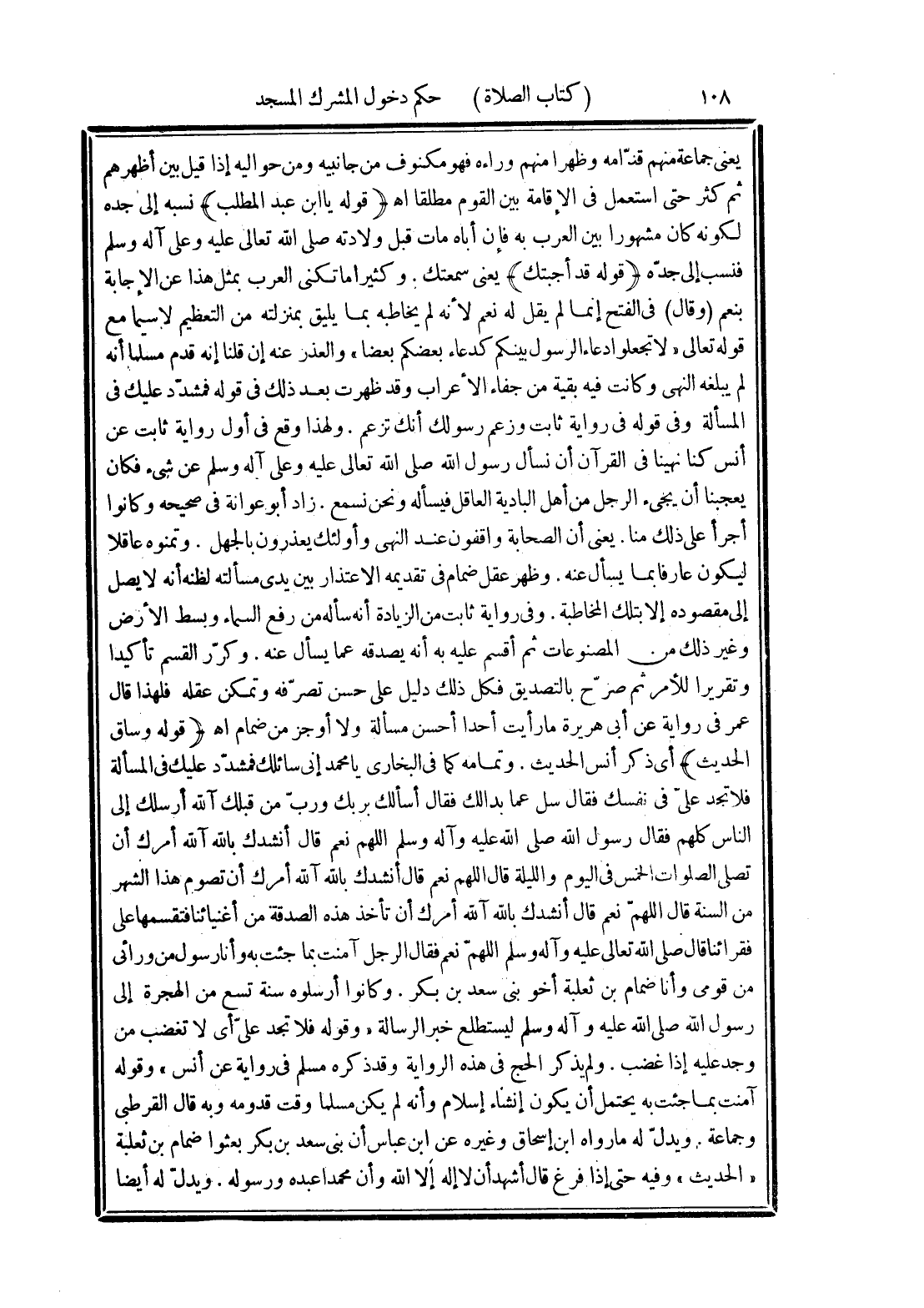 (قوله وساق الحديث) أى ذكر أنس الحديث. وتمامه كما في البخارى يا محمد إنى سائلك فمشدّد عليك في المسألة فلا تجد عليّ في نفسك فقال سل عما بدالك فقال أسألك بربك وربّ من قبلك آلله أرسلك إلى الناس كلهم فقال رسول الله صلى الله عليه وآله وسلم اللهم نعم قال أنشدك بالله آلله أمرك أن تصلي الصلوات الخمس في اليوم والليلة قال اللهم نعم قال أنشدك بالله آلله أمرك أن تصوم هذا الشهر من السنة قال اللهم نعم قال أنشدك بالله آلله أمرك أن تأخذ هذه الصدقة من أغنيائنا فتقسمها على فقرائنا قال صلى الله تعالى عليه وآله وسلم اللهم نعم فقال الرجل آمنت بما جئت به وأنا رسول من ورائى من قومى وأنا ضمام بن ثعلبة أخو بنى سعد بن بكر. وكانوا أرسلوه سنة تسع من الهجرة إلى رسول الله صلى الله عليه وآله وسلم ليستطلع خبر الرسالة "وقوله فلا تجد عليّ أى لا تغضب من وجد عليه إذا غضب. ولم يذكر الحج في هذه الرواية وقد ذكره مسلم في رواية عن أنس" وقوله آمنت بما جئت به يحتمل أن يكون إنشاء إسلام وأنه لم يكن مسلما وقت قدومه وبه قال القرطبي وجماعة. ويدلّ له ما رواه ابن إسحاق وغيره عن ابن عباس أن بني سعد بن بكر بعثوا ضمام بن ثعلبة "الحديث" وفيه حتى إذا فرغ قال أشهد أن لا إله إلا الله وأن محمدا عبده ورسوله. ويدل له أيضا