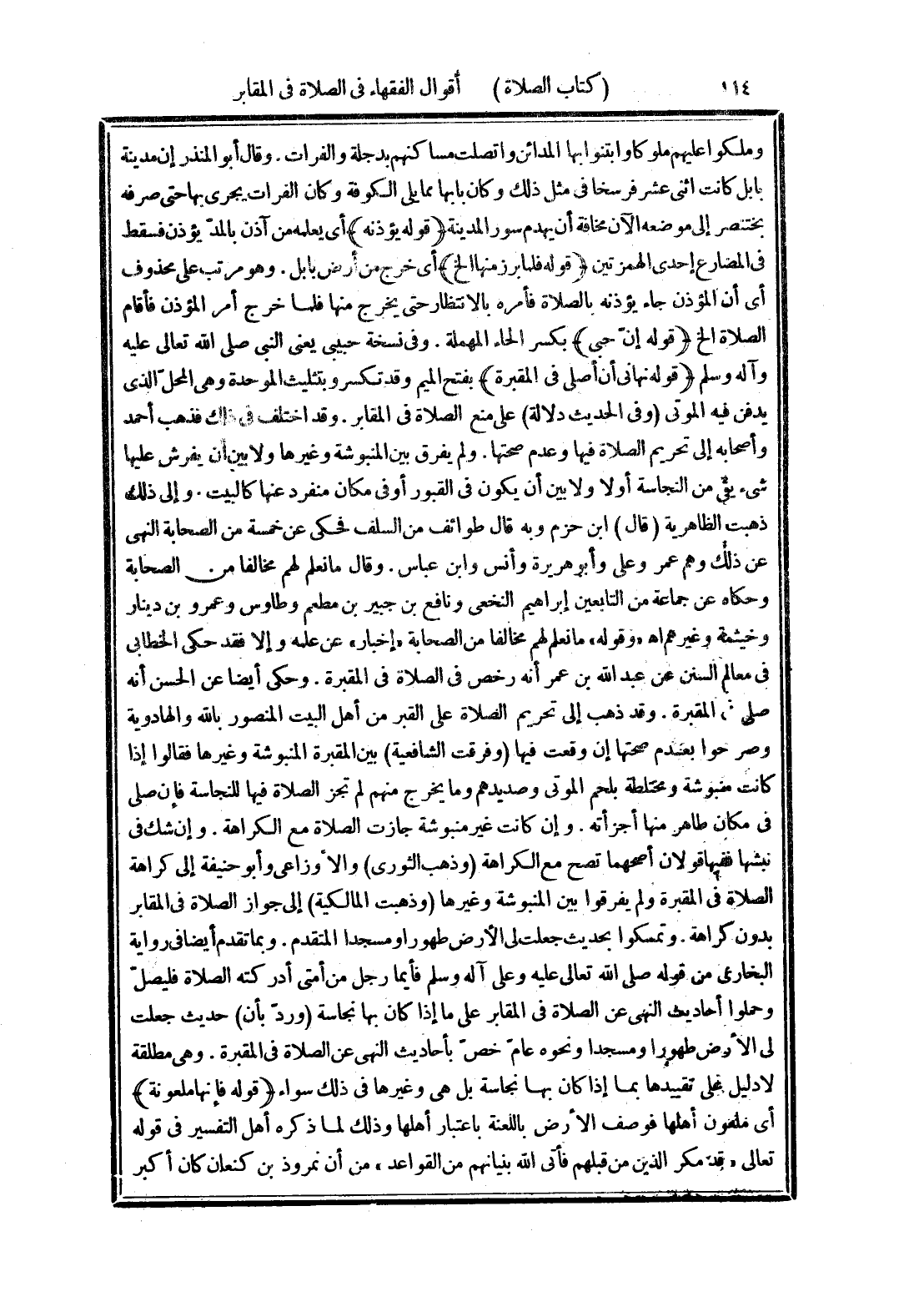(قوله نهاني أن أصلى في المقبرة) بفتح الميم وقد تكسر وبتثليث الموحدة وهى المحلّ الذى يذفن فيه الموتى (وفي الحديث دلالة) على منع الصلاة في المقابر. وقد اختلف في ذلك فذهب أحمد وأصحابه إلى تحريم الصلاة فيها وعدم صحتها. ولم يفرق بين المنبوشة وغيرها ولا بين أن يفرش عليها شيء يقي من النجاسة أولا ولا بين أن يكون في القبور أو في مكان منفرد عنها كالبيت. وإلى ذلك ذهبت الظاهرية (قال) ابن حزم وبه قال طوائف من السلف فحكى عن خمسة من الصحابة النهي كما ذلك وهم عمر وعلي وأبو هريرة وأنس وابن عباس. وقال ما نعلم لهم مخالفا من الصحابة وحكاه عن جماعة من التابعين إبراهيم النخعى ونافع بن جبير بن مطعم وطاوس وعمرو بن دينار وخيثمة وغيرهم اهـ "وقوله" ما نعلم لهم مخالفا من الصحابة "إخبار" عن علمه وإلا فقد حكى الخطابي في معالم السنن عن عبد الله بن عمر أنه رخص في الصلاة في المقبرة. وحكي أيضا عن الحسن أنه صلى في المقبرة. وقد ذهب إلى تحريم الصلاة على القبر من أهل البيت المنصور بالله والهادوية وصرحوا بعدم صحتها إن وقعت فيها (وفرقت الشافعية) بين المقبرة المنبوشة وغيرها فقالوا إذا كانت منبوشة ومختلطة بلحم الموتى وصديدهم وما يخرج منهم لم تجز الصلاة فيها للنجاسة فإن صلى في مكان طاهر منها أجزأته. وإن كانت غير منبوشة جازت الصلاة مع الكراهة. وإن شك في نبشها ففيها قولان أصحهما تصح مع الكراهة (وذهب الثورى) والأوزاعي وأبو حنيفة إلى كراهة الصلاة في المقبرة ولم يفرقوا بين المنبوشة وغيرها (وذهبت المالكية) إلى جواز الصلاة في المقابر بدون كراهة. وتمسكوا بحديث جعلت لى الأرض طهورا ومسجدا المتقدم. وبما تقدم أيضا في رواية البخارى من قوله صلى الله تعالى عليه وعلى آله وسلم فأيما رجل من أمتي أدركته الصلاة فليصلّ وحملوا أحاديث النهى عن الصلاة في المقابر على ما إذا كان بها نجاسة (وردّ بأن) حديث جعلت لى الأرض طهورا ومسجدا ونحوه عامّ خصّ بأحاديث النهى عن الصلاة في المقبرة. وهى مطلقة لا دليل على تقييدها بما إذا كان بها نجاسة بل هى وغيرها في ذلك سواء