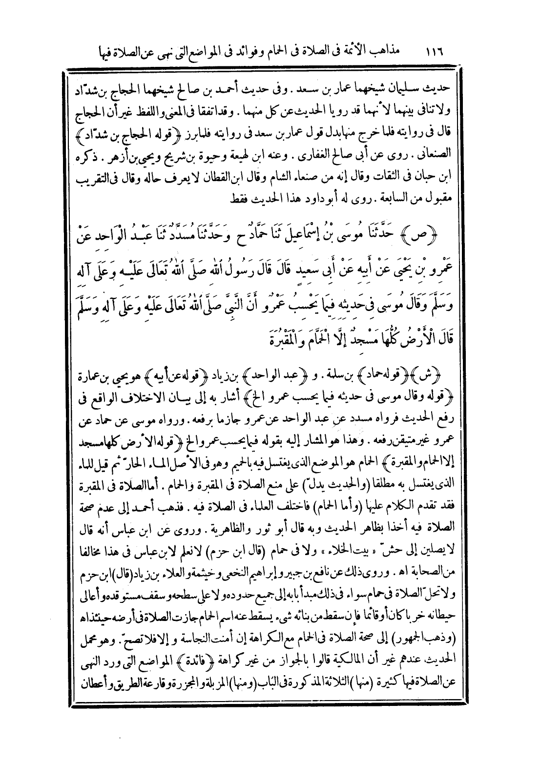 (ص) حَدَّثَنَا مُوسَى بْنُ إِسْمَاعِيلَ، ثَنَا حَمَّادٌ، ح وَحَدَّثَنَا مُسَدَّدٌ، ثَنَا عَبْدُ الْوَاحِدِ، عَنْ عَمْرِو بْنِ يَحْيَى، عَنْ أَبِيهِ، عَنْ أَبِي سَعِيدٍ، قَالَ: قَالَ رَسُولُ اللَّهِ صَلَّى اللهُ تَعَالَى عَلَيْهِ وَسَلَّمَ: -وَقَالَ مُوسَى فِي حَدِيثِهِ فِيمَا يَحْسَبُ عَمْرٌو- إِنَّ النَّبِيَّ صَلَّى اللهُ تَعَالَى عَلَيْهِ وَعَلَى آلِهِ وسَلَّمَ قَالَ: «الْأَرْضُ كُلُّهَا مَسْجِدٌ إِلَّا الْحَمَّامَ وَالْمَقْبَرَةَ»