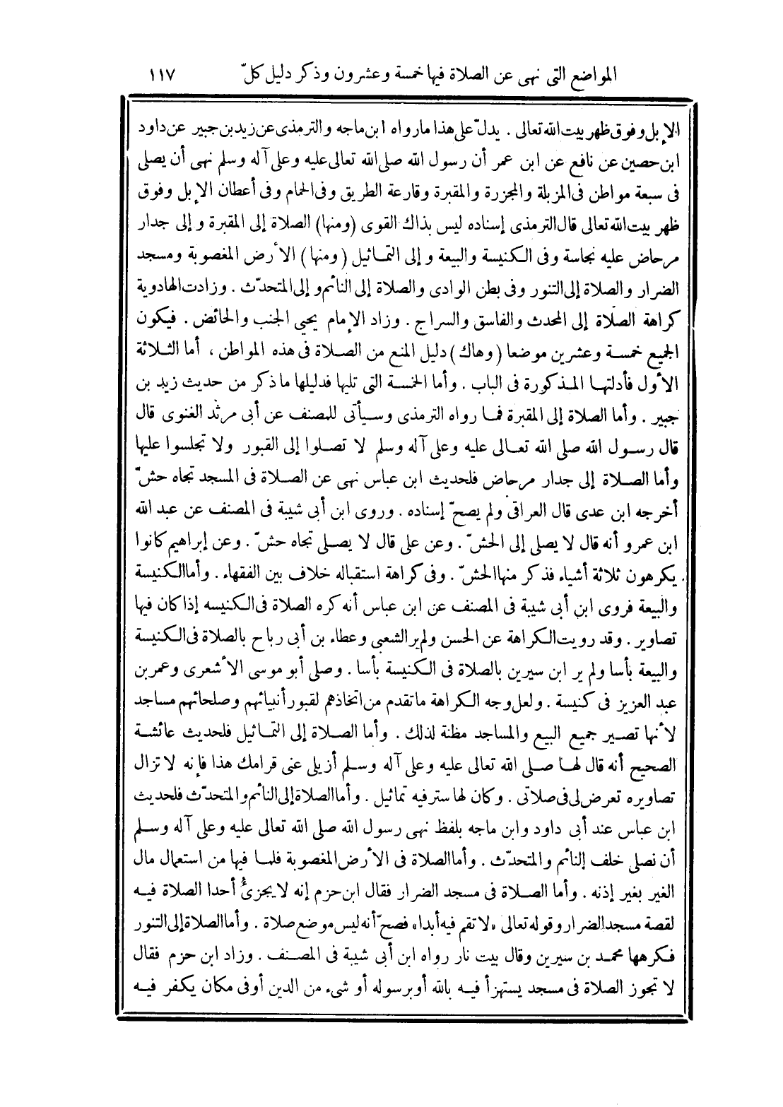 الإبل وفوق ظهر بيت الله تعالى. يدلّ على هذا ما رواه ابن ماجه والترمذى عن زيد بن جبير عن داود ابن حصين عن نافع عن ابن عمر أن رسول الله صلى الله تعالى عليه وعلى آله وسلم نهى أن يصلى في سبعة مواطن في المزبلة والمجزرة والمقبرة وقارعة الطريق وفى الحمام وفي أعطان الإبل وفوق ظهر بيت الله تعالى قال الترمذى إسناده ليس بذاك القوى (ومنها) الصلاة إلى المقبرة وإلى جدار مرحاض عليه نجاسة وفى الكنيسة والبيعة وإلى التماثيل (ومنها) الأرض المغصوبة ومسجد الضرار والصلاة إلى التنور وفى بطن الوادى والصلاة إلى النائم وإلى المتحدّث. وزادت الهادوية كراهة الصلاة إلى المحدث والفاسق والسراج. وزاد الإمام يحيى الجنب والحائض. فيكون الجميع خمسة وعشرين موضعا (وهاك) دليل المنع من الصلاة في هذه المواطن، أما الثلاثة الأول فأدلتها المذكورة في الباب. وأما الخمسة التي تليها فدليلها ما ذكر من حديث زيد بن جبير. وأما الصلاة إلى المقبرة فما رواه الترمذى وسيأتى للمصنف عن أبى مرثد الغنوى قال قال رسول الله صلى الله تعالى عليه وعلى آله وسلم لا تصلوا إلى القبور ولا تجلسوا عليها وأما الصلاة إلى جدار مرحاض فلحديث ابن عباس نهى عن الصلاة في المسجد تجاه حشّ أخرجه ابن عدى قال العراقي ولم يصحّ إسناده. وروى ابن أبى شيبة في المصنف عن عبد الله ابن عمرو أنه قال لا يصلى إلى الحشّ. وعن على قال لا يصل تجاه حشّ. وعن إبراهيم كانوا يكرهون ثلاثة أشياء فذكر منها الحشّ. وفى كراهة استقباله خلاف بين الفقهاء. وأما الكنيسة والبيعة فروى ابن أبى شيبة في المصنف عن ابن عباس أنه كره الصلاة في الكنيسة إذا كان فيها تصاوير. وقد رويت الكراهة عن الحسن ولم ير الشعبى وعطاء بن أبى رباح بالصلاة في الكنيسة والبيعة بأسا ولم ير ابن سيرين بالصلاة في الكنيسة بأسا. وصلى أبو موسى الأشعرى وعمر بن عبد العزيز في كنيسة. ولعل وجه الكراهة ما تقدم من اتخاذهم لقبور أنبيائهم وصلحائهم مساجد لأنها تصير جميع البيع والمساجد مظنة لذلك. وأما الصلاة إلى التماثيل فلحديث عائشة الصحيح أنه قال لها صلى الله تعالى عليه وعلى آله وسلم أزيلى عنى قرامك هذا فإنه لا تزال تصاويره تعرض لى في صلاتى. وكان لها ستر فيه تماثيل. وأما الصلاة إلى النائم والمتحدّث فلحديث ابن عباس عند أبى داود وابن ماجه بلفظ نهى رسول الله صلى الله تعالى عليه وعلى آله وسلم أن نصلى خلف النائم والمتحدّث. وأما الصلاة في الأرض المغصوبة فلما فيها من استعمال مال الغير بغير إذنه. وأما الصلاة في مسجد الضرار فقال ابن حزم إنه لا يجزئُ أحدا الصلاة فيه لقصة مسجد الضرار وقوله تعالى "لا تقم فيه أبدا" فصحّ أنه ليس موضع صلاة. وأما الصلاة إلى التنور فكرهها محمد بن سيرين وقال بيت نار رواه ابن أبى شيبة في المصنف. وزاد ابن حزم فقال لا تجوز الصلاة في مسجد يستهزأ فيه بالله أو برسوله أو شيء من الدين أو في مكان يكفر فيه