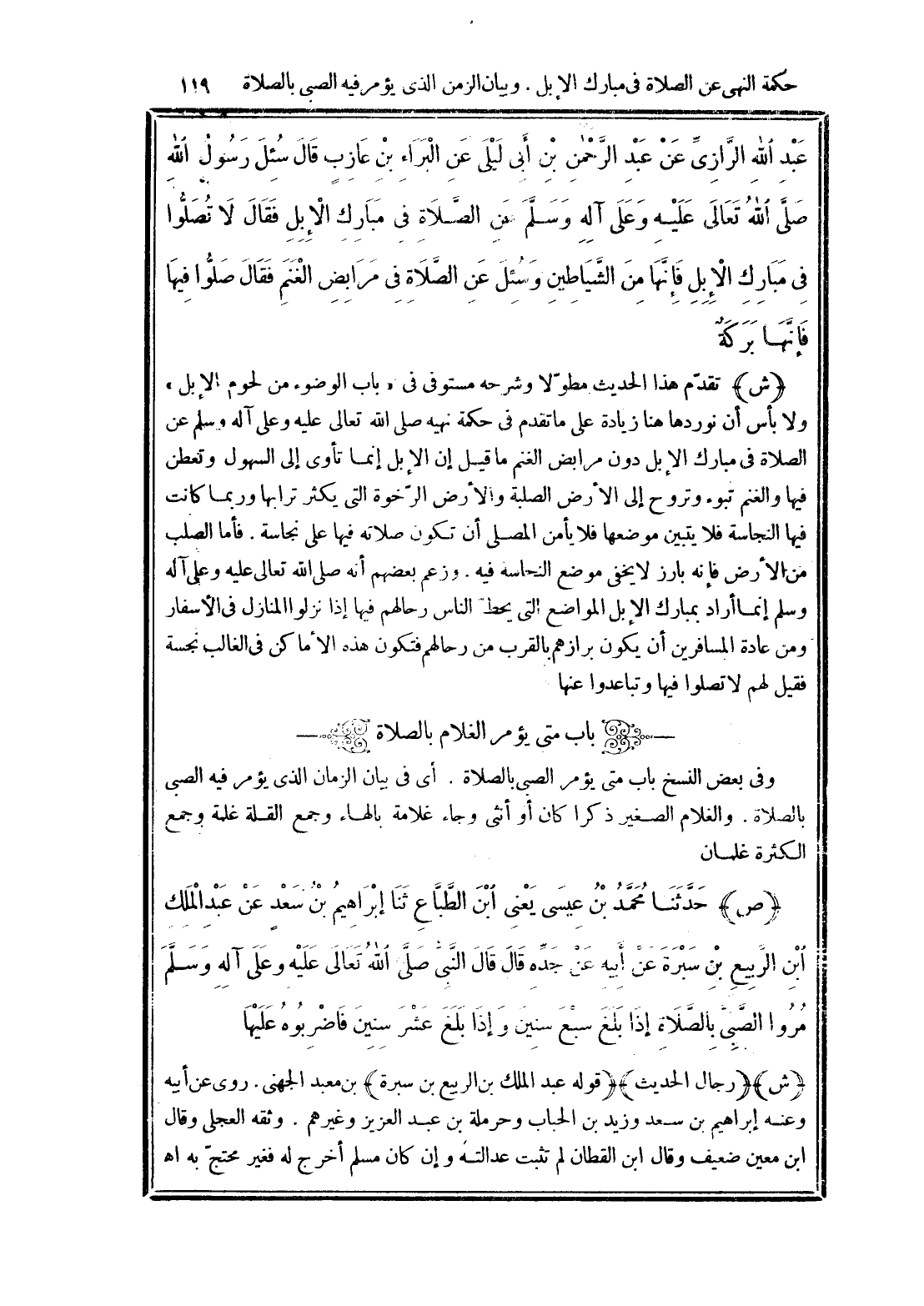 عَبْدِ اللَّهِ الرَّازِيِّ، عَنْ عَبْدِ الرَّحْمَنِ بْنِ أَبِي لَيْلَى، عَنِ الْبَرَاءِ بْنِ عَازِبٍ، قَالَ: سُئِلَ رَسُولُ اللَّهِ صَلَّى اللهُ تَعَالَى عَلَيْهِ وَعَلَى آلِهِ وسَلَّمَ عَنِ الصَّلَاةِ فِي مَبَارِكِ الْإِبِلِ؟ فَقَالَ: «لَا تُصَلُّوا فِي مَبَارِكِ الْإِبِلِ فَإِنَّهَا مِنَ الشَّيَاطِينِ» وَسُئِلَ عَنِ الصَّلَاةِ فِي مَرَابِضِ الْغَنَمِ؟ فَقَالَ: «صَلُّوا فِيهَا فَإِنَّهَا بَرَكَةٌ»