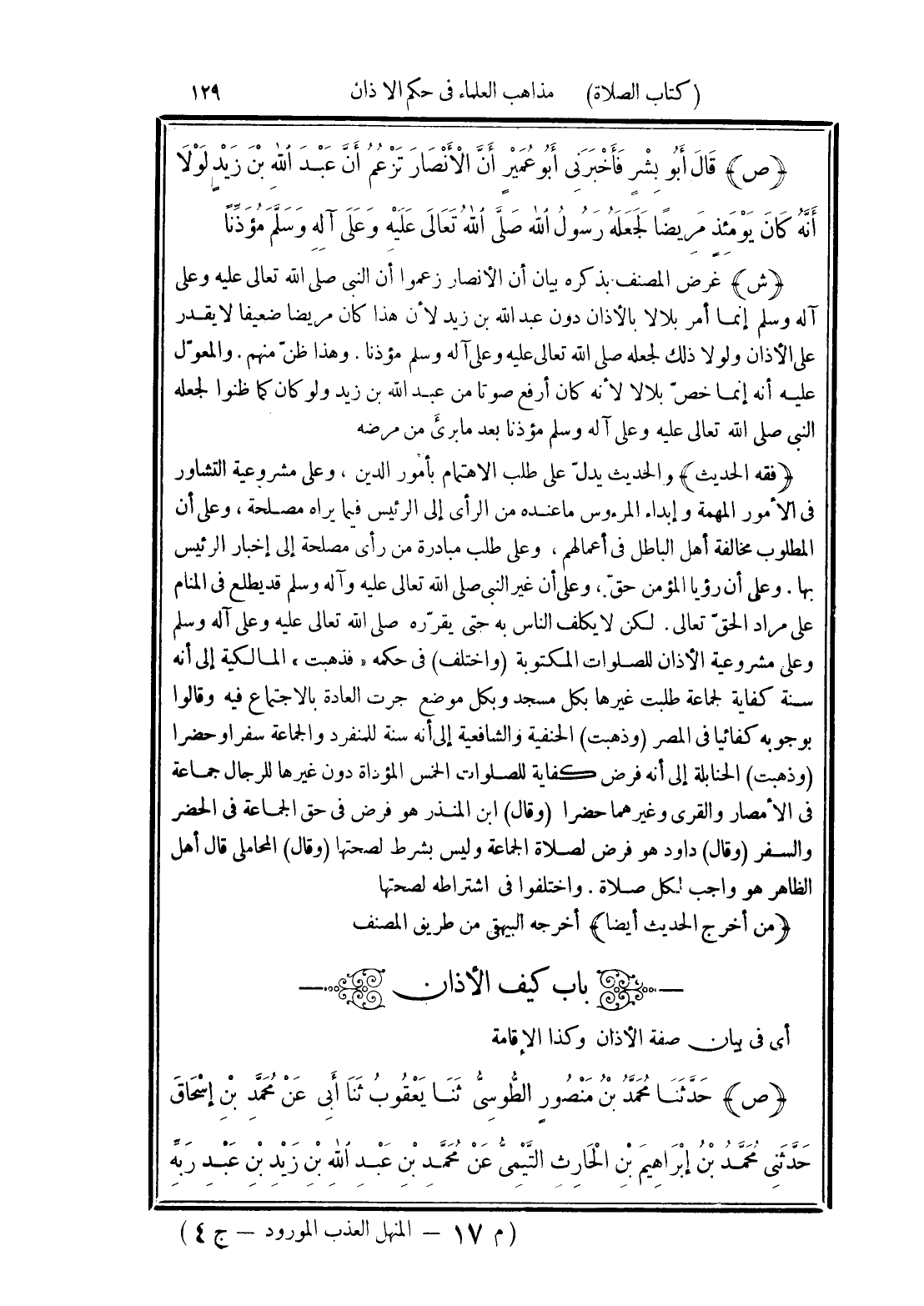 (فقه الحديث) والحديث يدلّ على طلب الاهتمام بأمور الدين، وعلى مشروعية التشاور في الأمور المهمة وإبداء المرءوس ما عنده من الرأى إلى الرئيس فيما يراه مصلحة، وعلى أن المطلوب مخالفة أهل الباطل في أعمالهم، وعلى طلب مبادرة من رأى مصلحة إلى إخبار الرئيس بها. وعلى أن رؤيا المؤمن حقّ، وعلى أن غير النبي صلى الله تعالى عليه وآله وسلم قد يطلع في المنام على مراد الحقّ تعالى. لكن لا يكلف الناس به حتى يقرّره صلى الله تعالى عليه وعلى آله وسلم وعلى مشروعية الأذان للصلوات المكتوبة (واختلف) في حكمه "فذهبت" المالكية إلى أنه سنة كفاية لجماعة طلبت غيرها بكل مسجد وبكل موضع جرت العادة بالاجتماع فيه وقالوا بوجوبه كفائيا في المصر (وذهبت) الحنفية والشافعية إلى أنه سنة للمنفرد والجماعة سفرا وحضرا (وذهبت) الحنابلة إلى أنه فرض كفاية للصلوات الخمس المؤداة دون غيرها للرجال جماعة في الأمصار والقرى وغيرهما حضرا (وقال) ابن المنذر هو فرض في حق الجماعة في الحضر والسفر (وقال) داود هو فرض لصلاة الجماعة وليس بشرط لصحتها (وقال) المحاملى قال أهل الظاهر هو واجب لكل صلاة. واختلفوا في اشتراطه لصحتها