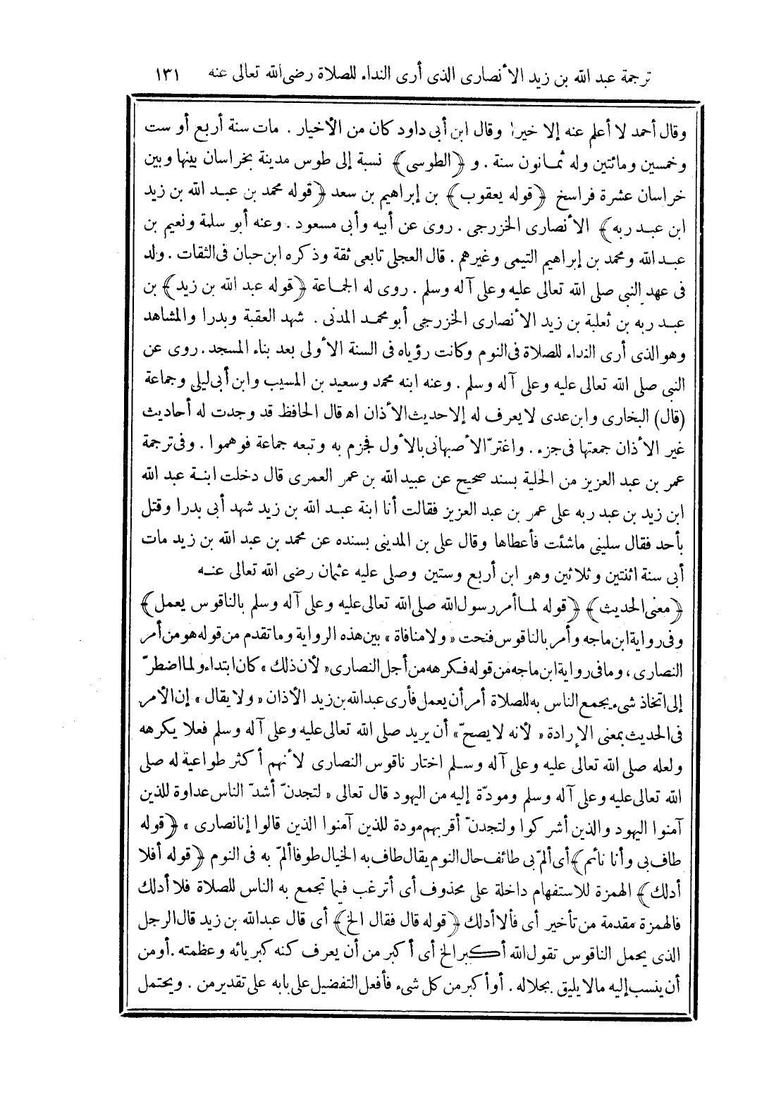 (قوله عبد الله بن زيد) بن عبد ربه بن ثعلبة بن زيد الأنصارى الخزرجى أبو محمد المدني. شهد العقبة وبدرا والمشاهد وهو الذى أرى النداء للصلاة في النوم وكانت رؤياه في السنة الأولى بعد بناء المسجد. روى عن النبى صلى الله تعالى عليه وعلى آله وسلم. وعنه ابنه محمد وسعيد بن المسيب وابن أبى ليلى وجماعة (قال) البخارى وابن عدى لا يعرف له إلا حديث الأذان اهـ قال الحافظ قد وجدت له أحاديث غير الأذان جمعتها في جزء. واغترّ الأصبهانى بالأول فجزم به وتبعه جماعة فوهموا. وفى ترجمة عمر بن عبد العزيز من الحلية بسند صحيح عن عبيد الله بن عمر العمرى قال دخلت ابنة عبد الله ابن زيد بن عبد ربه على عمر بن عبد العزيز فقالت أنا ابنة عبد الله بن زيد شهد أبى بدرا وقتل بأحد فقال سليني ما شئت فأعطاها وقال على بن المدينى بسنده عن محمد بن عبد الله بن زيد مات أبى سنة اثنتين وثلاثين وهو ابن أربع وستين وصلى عليه عثمان رَضِيَ اللَّهُ تَعَالَى عَنْهُ