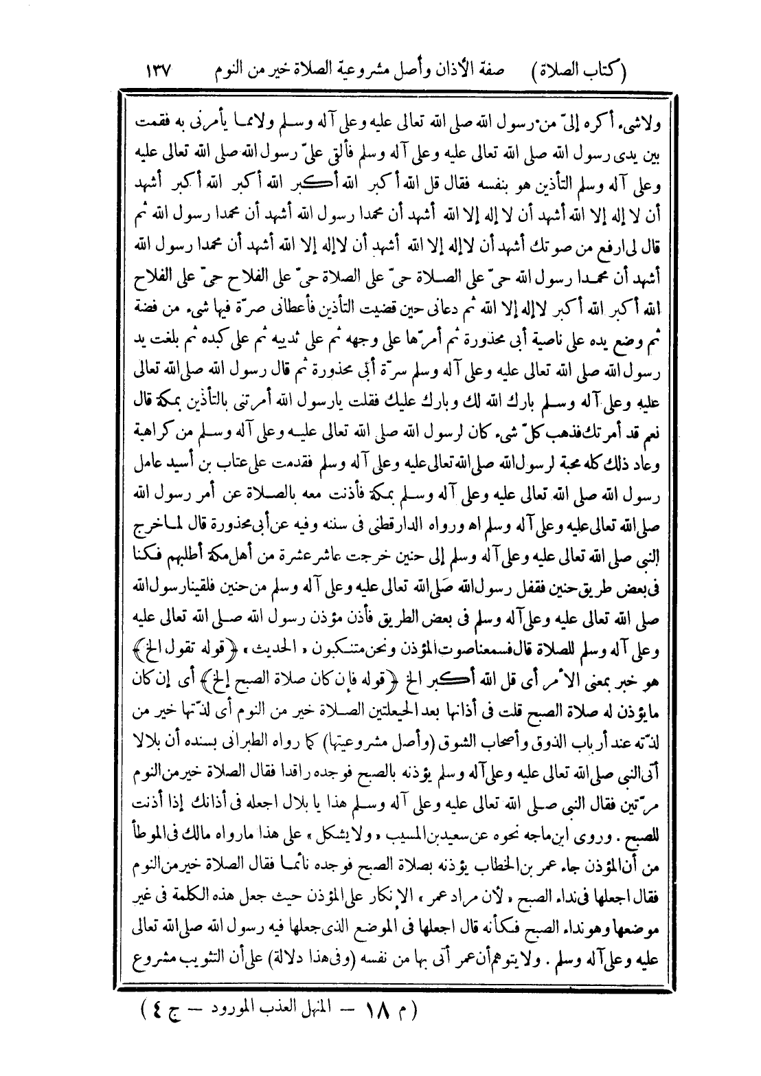 ولا شئ أكره إليّ من رسول الله صلى الله تعالى عليه وعلى آله وسلم ولا مما يأمرني به فقمت بين يدى رسول الله صلى الله تعالى عليه وعلى آله وسلم فألقى عليّ رسول الله صلى الله تعالى عليه وعلى آله وسلم التأذين هو بنفسه فقال قل الله أكبر الله أكبر الله أكبر الله أكبر أشهد أن لا إله إلا الله أشهد أن لا إله إلا الله أشهد أن محمدا رسول الله أشهد أن محمدا رسول الله ثم قال لى ارفع من صوتك أشهد أن لا إله إلا الله أشهد أن لا إله إلا الله أشهد أن محمدا رسول الله أشهد أن محمدا رسول الله حىّ على الصلاة حيّ على الصلاة حىّ على الفلاح حيّ على الفلاح الله أكبر الله أكبر لا إله إلا الله ثم دعانى حين قضيت التأذين فأعطانى صرّة فيها شئ من فضة ثم وضع يده على ناصية أبى محذورة ثم أمّرها على وجهه ثم على ثدييه ثم على كبده ثم بلغت يد رسول الله صلى الله تعالى عليه وعلى آله وسلم سرة أبي محذورة ثم قال رسول الله صلى الله تعالى عليه وعلى آله وسلم بارك الله لك وبارك عليك فقلت يا رسول الله أمرتنى بالتأذين بمكة قال نعم قد أمرتك فذهب كلّ شيء كان لرسول الله صلى الله تعالى عليه وعلى آله وسلم من كراهية وعاد ذلك كله محبة لرسول الله صلى الله تعالى عليه وعلى آله وسلم فقدمت على عتاب بن أسيد عامل رسول الله صلى الله تعالى عليه وعلى آله وسلم بمكة فأذنت معه بالصلاة عن أمر رسول الله صلى الله تعالى عليه وعلى آله وسلم اهـ ورواه الدارقطني في سننه وفيه عن أبى محذورة قال لما خرج النبي صلى الله تعالى عليه وعلى آله وسلم إلى حنين خرجت عاشر عشرة من أهل مكة أطلبهم فكنا في بعض طريق حنين فقفل رسول الله صلى الله تعالى عليه وعلى آله وسلم من حنين فلقينا رسول الله صلى الله تعالى عليه وعلى آله وسلم في بعض الطريق فأذن مؤذن رسول الله صلى الله تعالى عليه وعلى آله وسلم للصلاة قال فسمعنا صوت المؤذن ونحن متنكبون "الحديث"