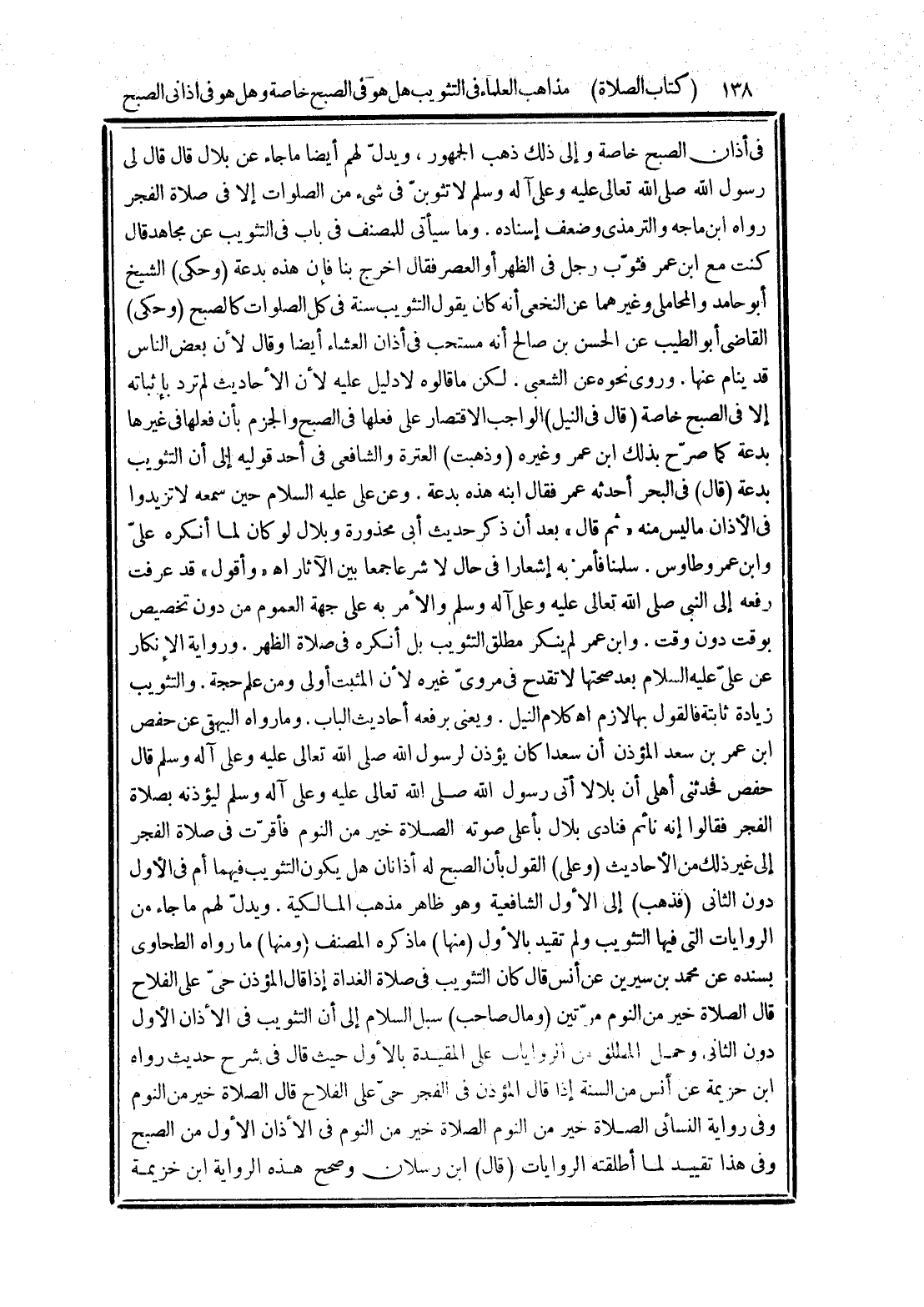 في أذان الصبح خاصة وإلى ذلك ذهب الجمهور، ويدلّ لهم أيضا ما جاء عن بلال قال قال لى رسول الله صلى الله تعالى عليه وعلى آله وسلم لا تثوبنّ في شيء من الصلوات إلا في صلاة الفجر رواه ابن ماجه والترمذى وضعف إسناده. وما سيأتى للمصنف في باب في الثويب عن مجاهد قال كنت مع ابن عمر فثوّب رجل في الظهر أو العصر فقال اخرج بنا فإن هذه بدعة (وحكى) الشيخ أبو حامد والمحاملى وغيرهما عن النخعى أنه كان يقول التثويب سنة في كل الصلوات كالصبح (وحكى) القاضى أبو الطيب عن الحسن بن صالح أنه مستحب في أذان العشاء أيضا وقال لأن بعض الناس قد ينام عنها. وروى نحوه عن الشعبي. لكن ما قالوه لا دليل عليه لأن الأحاديث لم ترد بإثباته إلا في الصبح خاصة (قال في النيل) الواجب الاقتصار على فعلها في الصبح والجزم بأن فعلها في غيرها بدعة كما صرّح بذلك ابن عمر وغيره (وذهبت) العترة والشافعى في أحد قوليه إلى أن التثويب بدعة (قال) في البحر أحدثه عمر فقال ابنه هذه بدعة. وعن على عليه السلام حين سمعه لا يزيدوا في الأذان ما ليس منه "ثم قال" بعد أن ذكر حديث أبى محذورة وبلال لو كان لما أنكره علىّ وابن عمر وطاوس. سلمنا فأمر به إشعارا في حال لا شرعا جمعا بين الآثار اهـ "وأقول" قد عرفت رفعه إلى النبي صلى الله تعالى عليه وعلى آله وسلم والأمر به على جهة العموم من دون تخصيص بوقت دون وقت. وابن عمر لم ينكر مطلق التثويب بل أنكره في صلاة الظهر. ورواية الإنكار عن علىّ عليه السلام بعد صحتها لا تقدح في مروىّ غيره لأن المثبت أولى ومن علم حجة. والتثويب زيادة ثابتة فالقول بها لازم اهـ كلام النيل. ويعنى برفعه أحاديث الباب. وما رواه البيهقى عن حفص ابن عمر في سعد المؤذن أن سعدا كان يؤذن لرسول الله صلى الله تعالى عليه وعلى آله وسلم قال حفص فحدثتي أهلى أن بلالا أتي رسول الله صلى الله تعالى عليه وعلى آله وسلم ليؤذنه بصلاة الفجر فقالوا إنه نائم فنادى بلال بأعلى صوته الصلاة خير من النوم فأقرّت في صلاة الفجر إلى غير ذلك من الأحاديث (وعلى) القول بأن الصبح له أذانان هل يكون التثويب فيهما أم في اللأول دون الثاني (فذهب) إلى الأول الشافعية وهو ظاهر مذهب المالكية. ويدلّ لهم ما جاء من الروايات التي فيها التثويب ولم تقيد بالأول (منها) ما ذكره المصنف (ومنها) ما رواه الطحاوى بسنده عن محمد بن سيرين عن أنس قال كان التثويب في صلاة الغداة إذا قال المؤذن حي على الفلاح قال الصلاة خير من النوم مرّتين (ومال صاحب) سبل السلام إلى أن التثويب في الأذان الأول دون الثاني وحمل المطلق من الروايات على المقيدة بالأول حيث قال في شرح حديث رواه ابن خزيمة عن أنس من السنة إذا قال المؤذن في الفجر حي على الفلاح قال الصلاة خير من النوم وفى رواية النسائى الصلاة خير من النوم الصلاة خير من النوم في الأذان الأول من الصبح وفي هذا تقييد لما أطلقته الروايات (قال) ابن رسلان وصحح هذه الرواية ابن خزيمة