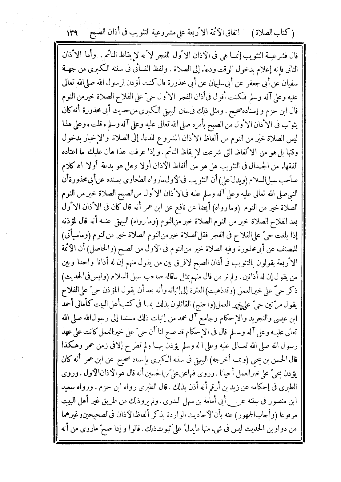 قال فشرعية التثويب إنما في الأذان الأول للفجر لأنه لإيقاظ النائم. وأما الأذان الثانى فإنه إعلام بدخول الوقت ودعاء إلى الصلاة. ولفظ النسائى في سننه الكبرى من جهة سفيان عن أبى جعفر عن أبى سليمان عن أبى محذورة قال كنت أؤذن لرسول الله صلى الله تعالى عليه وعلى آله وسلم فكنت أقول في أذان الفجر الأول حىّ على الفلاح الصلاة خير من النوم قال ابن حزم وإسناده صحيح. ومثل ذلك في سنن البيهقى الكبرى من حديث أبى محذورة أنه كان يثوّب في الأذان الأول من الصبح بأمره صلى الله تعالى عليه وعلى آله وسلم "قلت" وعلى هذا ليس الصلاة خير من النوم من ألفاظ الأذان المشروع للدعاء إلى الصلاة والإخبار بدخول وقتها بل هو من الألفاظ التى شرعت لإيقاظ النائم. وإذا عرفت هذا هان عليك ما اعتاده الفقهاء من الجدال في التثويب هل هو من ألفاظ الأذان أو لا وهل هو بدعة أو لا اهـ كلام صاحب سبل السلام (ويدلّ على) أن التثويب في الأول ما رواه الطحاوى بسنده عن أبى محذورة أن النبي صلى الله تعالى عليه وعلى آله وسلم علمه في الأذان الأول من الصبح الصلاة خير من النوم الصلاة خير من النوم (وما رواه) أيضا عن نافع عن ابن عمر أنه قال كان في الأذان الأول بعد الفلاح الصلاة خير من النوم الصلاة خير من النوم (وما رواه) البيهقى عنه أنه قال لمؤذنه إذا بلغت حىّ على الفلاح في الفجر فقل الصلاة خير من النوم الصلاة خير من النوم (وما سيأتى) للمصنف عن أبى محذورة وفيه الصلاة خير من النوم في الأول من الصبح (والحاصل) أن الأئمة الأربعة يقولون بالتثويب في أذان الصبح لا فرق بين من يقول منهم إن له أذانا واحدا وبين من يقول إن له أذانين. ولم نر من قال منهم بمثل ما قاله صاحب سبل السلام (وليس في الحديث) ذكر حىّ على خير العمل (وقد ذهبت) العترة إلى إثباته وأنه بعد أن يقول المؤذن حىّ على الفلاح يقول مرّتين حيّ على خير العمل (واحتج) القائلون بذلك بما في كتب أهل البيت كأمالى أحمد ابن عيسى والتجريد والإحكام وجامع آل محمد من إثبات ذلك مسندا إلى رسول الله صلى الله تعالى عليه وعلى آله وسلم قال في الإحكام قد صح لنا أن حىّ على خير العمل كانت على عهد رسول الله صلى الله تعالى عليه وعلى آله وسلم يؤذن بها وتطرح إلا في زمن عمر وهكذا قال الحسن بن يحيى (وبما أخرجه) البيهقى في سننه الكبرى بإسناد صحيح عن ابن عمر أنه كان يؤذن بحيّ على خير العمل أحيانا. وروى فيها عن علىّ بن الحسين أنه قال هو الأذان الأول. وروى الطبرى في إحكامه عن زيد بن أرقم أنه أذن بذلك. قال الطبرى رواه ابن حزم. ورواه سعيد ابن منصور في سننه عن أبى أمامة بن سهل البدرى. ولم يرو ذلك من طريق غير أهل البيت مرفوعا (وأجاب الجمهور) عنه بأن الأحاديث الواردة بذكر ألفاظ الأذان في الصحيحين وغيرهما من دواوين الحديث ليس في شيء منها ما يدلّ على ثبوت ذلك. قالوا وإذا صحّ ما روى من أنه