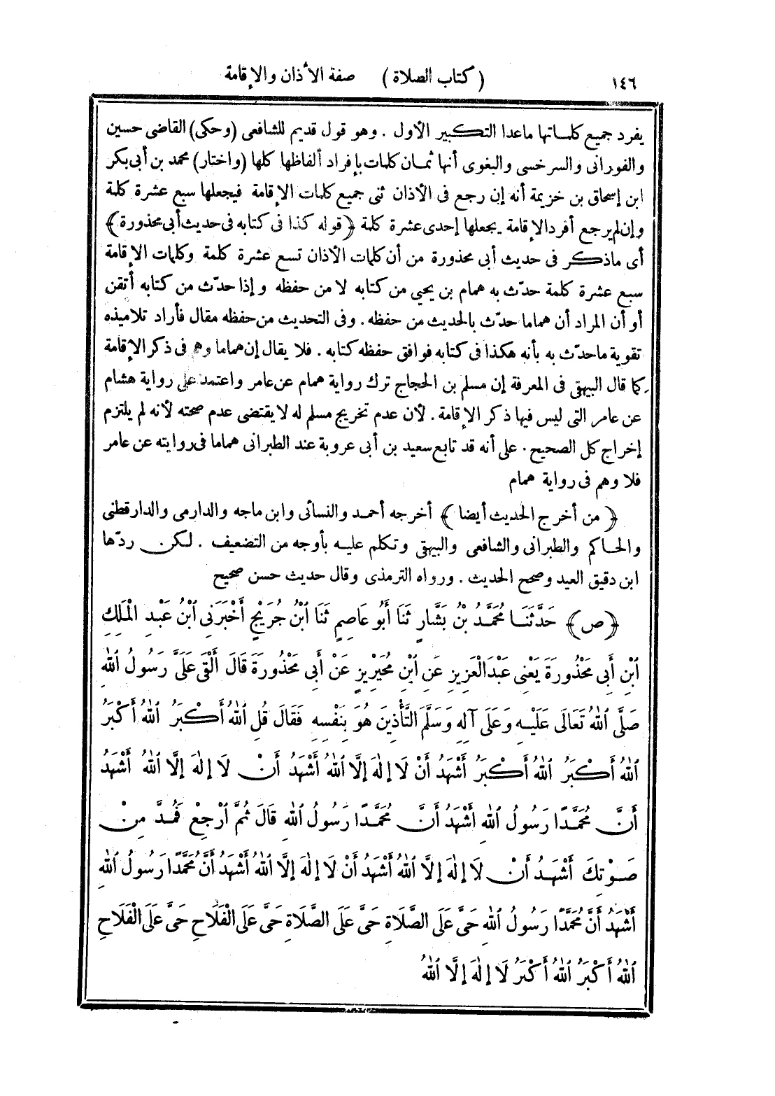 (قوله كذا في كتابه في حديث أبى محذورة) أى ما ذكر في حديث أبى محذورة من أن كلمات الأذان تسع عشرة كلمة وكلمات الإقامة سبع عشرة كلمة حدّث به همام بن يحيى من كتابه لا من حفظه وإذا حدّث من كتابه أتقن أو أن المراد أن هماما حدّث بالحديث من حفظه. وفي التحديث من لفظه مقال فأراد تلاميذه تقوية ما حدّث به بأنه هكذا في كتابه فوافق حفظه كتابه. فلا يقال إن هماما وهم في ذكر الإقامة كما قال البيهقي في المعرفة إن مسلم بن الحجاج ترك رواية همام عن عامر واعتمد على رواية هشام عن عامر التي ليس فيها ذكر الإقامة؛ لأن عدم تخريج مسلم له لا يقتضى عدم صحته لأنه لم يلتزم إخراج كل الصحيح. على أنه قد تابع سعيد بن أبى عروبة عند الطبراني هماما في روايته عن عامر فلا وهم في رواية همام