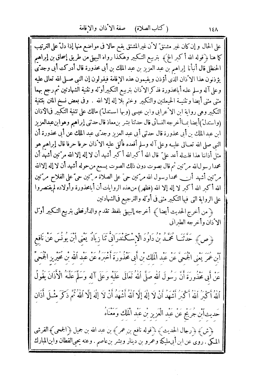 (ص) حَدَّثَنَا مُحَمَّدُ بْنُ دَاوُدَ الْإِسْكَنْدَرَانِيُّ، ثَنَا زِيَادٌ يَعْنِي ابْنَ يُونُسَ، عَنْ نَافِعِ بْنِ عُمَرَ يَعْنِي الْجُمَحِيَّ، عَنْ عَبْدِ الْمَلِكِ بْنِ أَبِي مَحْذُورَةَ، أَخْبَرَهُ عَنْ عَبْدِ اللَّهِ بْنِ مُحَيْرِيزٍ الْجُمَحِيِّ، عَنْ أَبِي مَحْذُورَةَ، أَنَّ رَسُولَ اللَّهِ صَلَّى اللهُ تَعَالَى عَلَيْهِ وَعَلَى آلِهِ وسَلَّمَ عَلَّمَهُ الْأَذَانَ يَقُولُ: «اللَّهُ أَكْبَرُ اللَّهُ أَكْبَرُ، أَشْهَدُ أَنْ لَا إِلَهَ إِلَّا اللَّهُ، أَشْهَدُ أَنْ لَا إِلَهَ إِلَّا اللَّهُ»، ثُمَّ ذَكَرَ مِثْلَ أَذَانِ حَدِيثِ ابْنِ جُرَيْجٍ، عَنْ عَبْدِ الْعَزِيزِ بْنِ عَبْدِ الْمَلِكِ، وَمَعْنَاهُ.