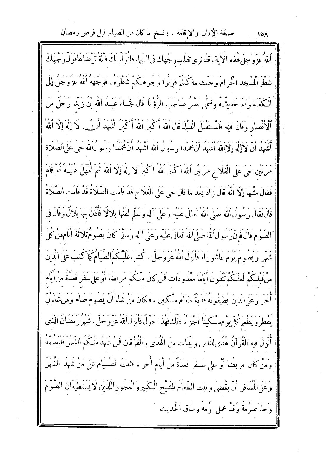 اللَّهُ عَزَّ وَجَلَّ هَذِهِ الْآيَةَ: {قَدْ نَرَى تَقَلُّبَ وَجْهِكَ فِي السَّمَاءِ فَلَنُوَلِّيَنَّكَ قِبْلَةً تَرْضَاهَا فَوَلِّ وَجْهَكَ شَطْرَ الْمَسْجِدِ الْحَرَامِ وَحَيْثُ مَا كُنْتُمْ فَوَلُّوا وُجُوهَكُمْ شَطْرَهُ} [البقرة: 144] فَوَجَّهَهُ اللَّهُ عَزَّ وَجَلَّ إِلَى الْكَعْبَةِ -وَتَمَّ حَدِيثُهُ- وَسَمَّى نَصْرٌ صَاحِبَ الرُّؤْيَا، قَالَ: فَجَاءَ عَبْدُ اللَّهِ بْنُ زَيْدٍ، رَجُلٌ مِنَ الْأَنْصَارِ، وَقَالَ فِيهِ: فَاسْتَقْبَلَ الْقِبْلَةَ، قَالَ: اللَّهُ أَكْبَرُ اللَّهُ أَكْبَرُ، أَشْهَدُ أَنْ لَا إِلَهَ إِلَّا اللَّهُ، أَشْهَدُ أَنْ لَا إِلَهَ إِلَّا اللَّهُ، أَشْهَدُ أَنَّ مُحَمَّدًا رَسُولُ اللَّهِ، أَشْهَدُ أَنَّ مُحَمَّدًا رَسُولُ اللَّهِ، حَيَّ عَلَى الصَّلَاةِ، مَرَّتَيْنِ، حَيَّ عَلَى الْفَلَاحِ، مَرَّتَيْنِ، اللَّهُ أَكْبَرُ، اللَّهُ أَكْبَرُ، لَا إِلَهَ إِلَّا اللَّهُ، ثُمَّ أَمْهَلَ هُنَيَّةً، ثُمَّ قَامَ، فَقَالَ مِثْلَهَا، إِلَّا أَنَّهُ قَالَ: زَادَ بَعْدَ مَا قَالَ: حَيَّ عَلَى الْفَلَاحِ، قَدْ قَامَتِ الصَّلَاةُ، قَدْ قَامَتِ الصَّلَاةُ، قَالَ: فَقَالَ رَسُولُ اللَّهِ صَلَّى اللهُ تَعَالَى عَلَيْهِ وَعَلَى آلِهِ وسَلَّمَ: «لَقِّنْهَا بِلَالًا» فَأَذَّنَ بِهَا بِلَالٌ. وَقَالَ فِي الصَّوْمِ: قَالَ: فَإِنَّ رَسُولَ اللَّهِ صَلَّى اللهُ تَعَالَى عَلَيْهِ وَعَلَى آلِهِ وسَلَّمَ كَانَ " يَصُومُ ثَلَاثَةَ أَيَّامٍ مِنْ كُلِّ شَهْرٍ، وَيَصُومُ يَوْمَ عَاشُورَاءَ، فَأَنْزَلَ اللَّهُ عَزَّ وَجَلَّ: {كُتِبَ عَلَيْكُمُ الصِّيَامُ كَمَا كُتِبَ عَلَى الَّذِينَ مِنْ قَبْلِكُمْ لَعَلَّكُمْ تَتَّقُونَ (183) أَيَّامًا مَعْدُودَاتٍ فَمَنْ كَانَ مِنْكُمْ مَرِيضًا أَوْ عَلَى سَفَرٍ فَعِدَّةٌ مِنْ أَيَّامٍ أُخَرَ وَعَلَى الَّذِينَ يُطِيقُونَهُ فِدْيَةٌ طَعَامُ مِسْكِينٍ} [البقرة: 183، 184] فَكان مَنْ شَاءَ أَنْ يَصُومَ صَامَ، وَمَنْ شَاءَ أَنْ يُفْطِرَ، وَيُطْعِمَ كُلَّ يَوْمٍ مِسْكِينًا، أَجْزَأَهُ ذَلِكَ، فَهَذَا حَوْلٌ، فَأَنْزَلَ اللَّهُ عَزَّ وَجَلَّ: {شَهْرُ رَمَضَانَ الَّذِي أُنْزِلَ فِيهِ الْقُرْآنُ هُدًى لِلنَّاسِ وَبَيِّنَاتٍ مِنَ الْهُدَى وَالْفُرْقَانِ فَمَنْ شَهِدَ مِنْكُمُ الشَّهْرَ فَلْيَصُمْهُ وَمَنْ كَانَ مَرِيضًا أَوْ عَلَى سَفَرٍ فَعِدَّةٌ مِنْ أَيَّامٍ أُخَرَ} [البقرة: 185] فَثَبَتَ الصِّيَامُ عَلَى مَنْ شَهِدَ الشَّهْرَ وَعَلَى الْمُسَافِرِ أَنْ يَقْضِيَ، وَثَبَتَ الطَّعَامُ لِلشَّيْخِ الْكَبِيرِ وَالْعَجُوزِ اللَّذَيْنِ لَا يَسْتَطِيعَانِ الصَّوْمَ "، وَجَاءَ صِرْمَةُ وَقَدْ عَمِلَ يَوْمَهُ وَسَاقَ الْحَدِيثَ