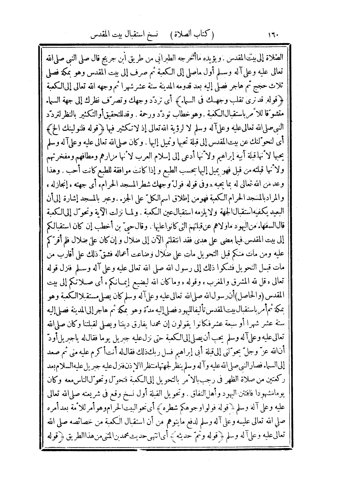 الصلاة إلى بيت المقدس. ويؤيده ما أخرجه الطبراني من طريق ابن جريج قال صلى النبي صلى الله تعالى عليه وعلى آله وسلم أول ما صلى إلى الكعبة ثم صرف إلى بيت المقدس وهو بمكة فصلى ثلاث حجج ثم هاجر فصلى إليه بعد قدومه المدينة ستة عشر شهرا ثم وجهه الله تعالى إلى الكعبة