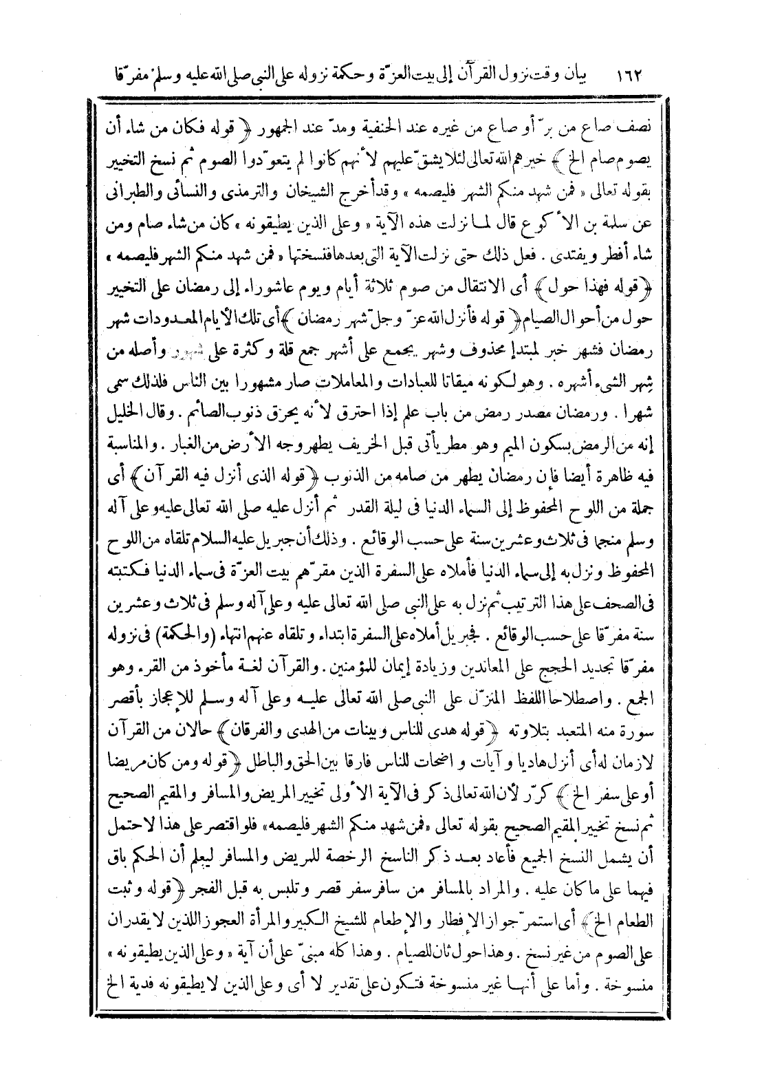 (قوله الذى أنزل فيه القرآن) أى جملة من اللوح المحفوظ إلى السماء الدنيا في ليلة القدر ثم أنزل عليه صلى الله تعالى عليه وعلى آله وسلم منجما في ثلاث وعشرين سنة على حسب الوقائع. وذلك أن جبريل عليه السلام تلقاه من اللوح المحفوظ ونزل به إلى سماء الدنيا فأملاه على السفرة الذين مقرّهم بيت العزّة في سماء الدنيا فكتبته في الصحف على هذا الترتيب ثم نزل به علي النبى صلى الله تعالى عليه وعلى آله وسلم في ثلاث وعشرين سنة مفرّقا على حسب الوقائع. فجبريل أملاه على السفرة ابتداء وتلقاه عنهم انتهاء (والحكمة) في نزوله مفرّقا تجديد الحجج على المعاندين وزيادة إيمان للؤمنين. والقرآن لغة ماخوذ من القرء وهو الجمع. واصطلاحا اللفظ المنزل على النبى صلى الله تعالى عليه وعلى آله وسلم للإعجاز بأقصر سورة منه المتعبد بتلاوته