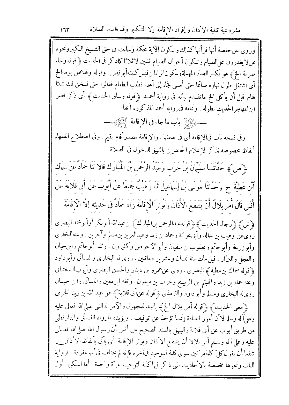 (ص) حَدَّثَنَا سُلَيْمَانُ بْنُ حَرْبٍ، وَعَبْدُ الرَّحْمَنِ بْنُ الْمُبَارَكِ، قَالَا: ثَنَا حَمَّادٌ، عَنْ سِمَاكِ بْنِ عَطِيَّةَ، ح وَحَدَّثَنَا مُوسَى بْنُ إِسْمَاعِيلَ، حَدَّثَنَا وُهَيْبٌ، جَمِيعًا عَنْ أَيُّوبَ، عَنْ أَبِي قِلَابَةَ، عَنْ أَنَسٍ، قَالَ: «أُمِرَ بِلَالٌ أَنْ يَشْفَعَ الْأَذَانَ وَيُوتِرَ الْإِقَامَةَ»، زَادَ حَمَّادٌ فِي حَدِيثِهِ: إِلَّا الْإِقَامَةَ.