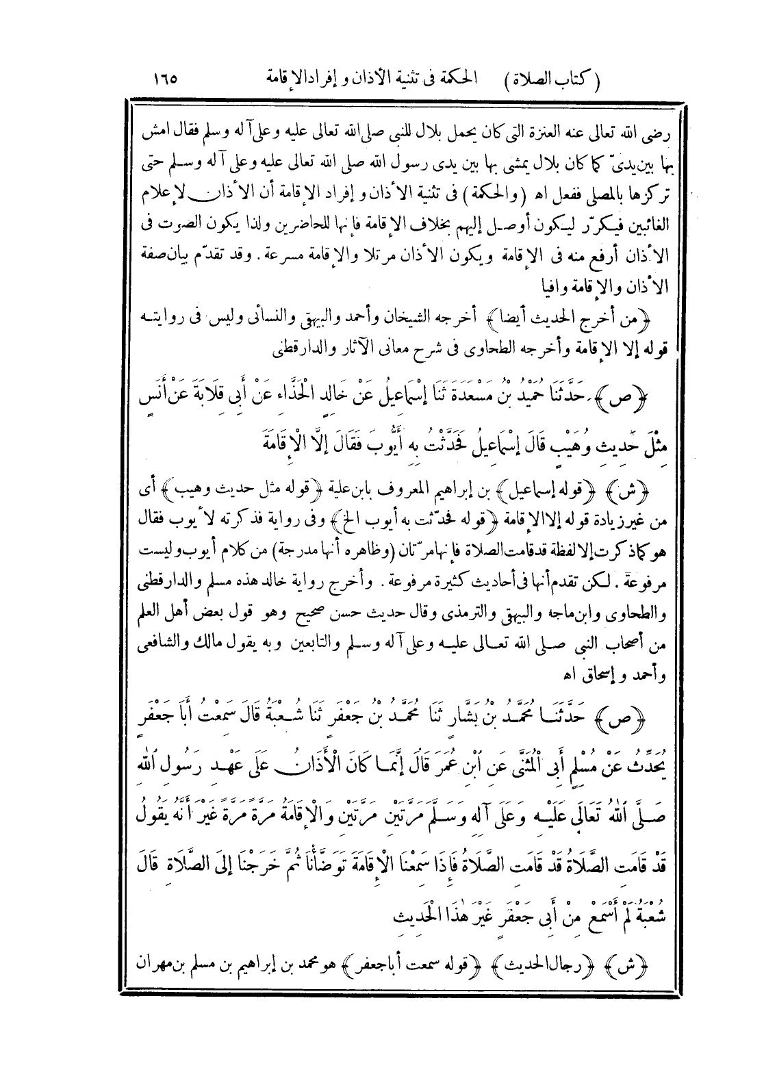 (قوله فحدّثت به أيوب الخ) وفى رواية فذكرته لأيوب فقال هو كما ذكرت إلا لفظة قد قامت الصلاة فإنها مرّتان (وظاهره أنها مدرجة) من كلام أيوب وليست مرفوعة. لكن تقدم أنها في أحاديث كثيرة مرفوعة. وأخرج رواية خالد هذه مسلم والدارقطني والطحاوى وابن ماجة والبيهقى والترمذى وقال حديث حسن صحيح وهو قول بعض أهل العلم من أصحاب النبى صلى الله تعالى عليه وعلى آله وسلم والتابعين وبه يقول مالك والشافعى وأحمد وإبن إسحاق اهـ