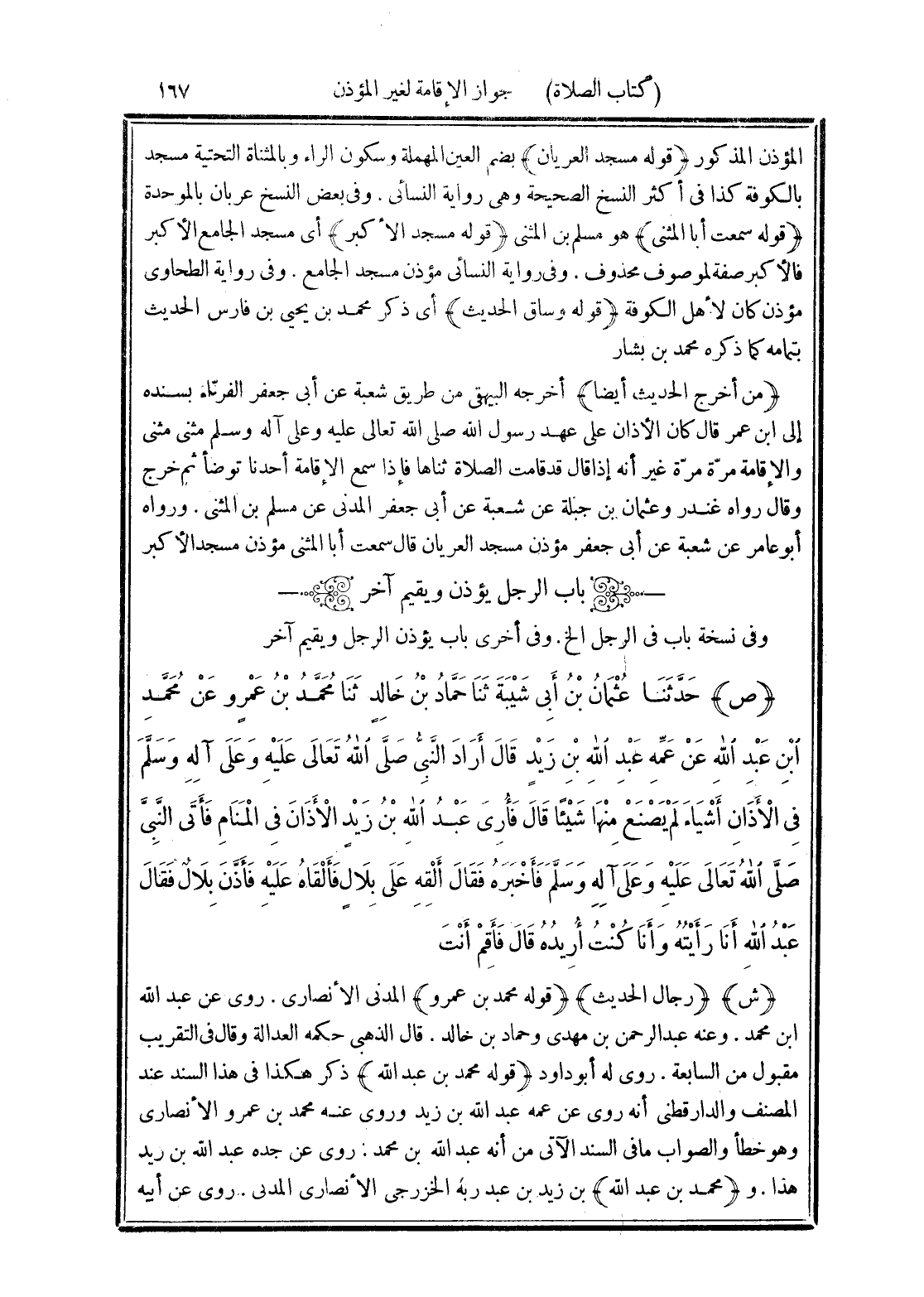 (قوله محمد بن عبد الله) ذكر هكذا في هذا السند عند المصنف والدارقطنى أنه روى عن عمه عبد الله بن زيد وروى عنه محمد بن عمرو الأنصارى وهو خطأ والصواب ما في السند الآتى من أنه عبد الله بن محمد. روى عن جده عبد الله بن زيد هذا. و (محمد بن عبد الله) بن زيد بن عبد ربه الخزرجى الأنصارى المدني. روى عن أبيه