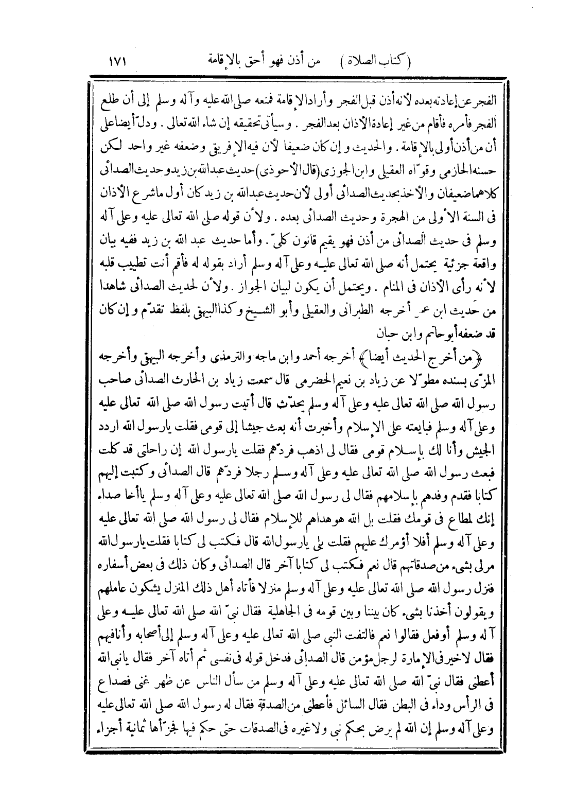 الفجر عن إعادته بعده لأنه أذن قبل الفجر وأراد الإقامة فمنعه صلى الله عليه وآله وسلم إلى أن طلع الفجر فأمره فأقام من غير إعادة الأذان بعد الفجر. وسيأتى تحقيقه إن شاء الله تعالى. ودلّ أيضا على أن من أذن أولى بالإقامة. والحديث وإن كان ضعيفا لأن فيه الإفريقى وضعفه غير واحد لكن حسنه الحازمى وقوّاه العقيلى وابن الجوزى (قال الأحوذى) حديث عبد الله بن زيد وحديث الصدائى كلاهما ضعيفان والأخذ بحديث الصدائى أولى لأن حديث عبد الله بن زيد كان أول ما شرع الأذان في السنة الأولى من الهجرة وحديث الصدائى بعده. ولأن قوله صلى الله تعالى عليه وعلى آله وسلم في حديث الصدائى من أذن فهو يقيم قانون كلىّ. وأما حديث عبد الله بن زيد ففيه بيان واقعة جزئية يحتمل أنه صلى الله تعالى عليه وعلى آله وسلم أراد بقوله له فأقم أنت تطييب قلبه لأنه رأى الأذان في المنام. ويحتمل أن يكون لبيان الجواز. ولأن لحديث الصدائى شاهدا من حديث ابن عمر أخرجه الطبرانى والعقيلى وأبو الشيخ وكذا البيهقي بلفظ تقدّم وإن كان قد ضعفه أبو حاتم وابن حبان