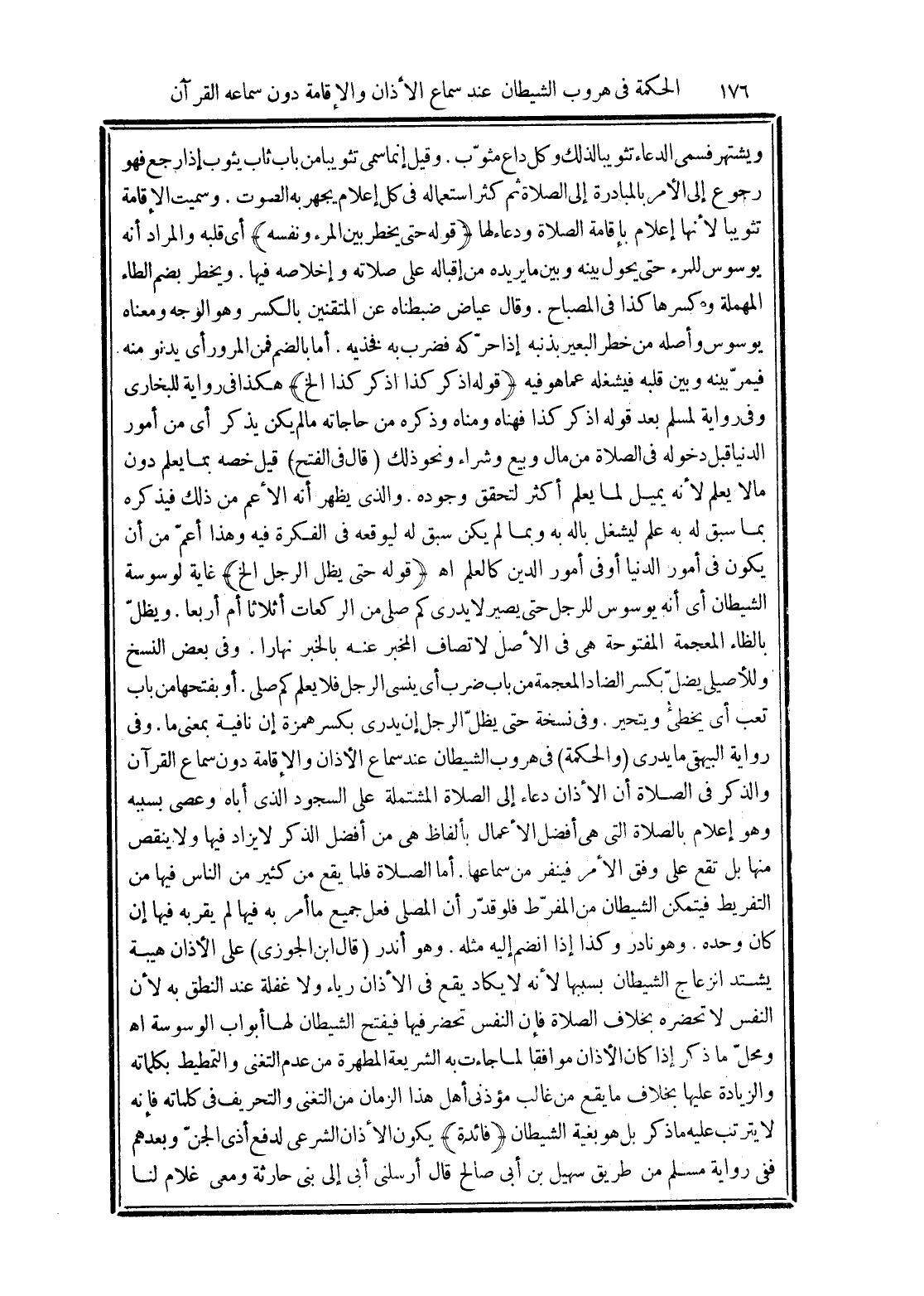 (قوله حتى يظل الرجل الخ) غاية لوسوسة الشيطان أى أنه يوسوس للرجل حتى يصير لا يدرى كم صلى من الركعات أثلاثا أم أربعا. ويظلّ بالظاء المعجمة المفتوحة هي في الأصل لاتصاف المخبر عنه بالخبر نهارا. وفي بعض النسخ وللأصيلى يضلّ بكسر الضاد المعجمة من باب ضرب أي ينسى الرجل فلا يعلم كم صلى. أو بفتحها من باب تعب أى يخطئُ ويتحير. وفي نسخة حتى يظلّ الرجل إن يدرى بكسر همزة إن نافية بمعنى ما. وفي رواية البيهقى ما يدرى (والحكمة) في هروب الشيطان عند سماع الأذان والإقامة دون سماع القرآن والذكر في الصلاة أن الأذان دعاء إلى الصلاة المشتملة على السجود الذى أباه وعصى بسببه وهو إعلام بالصلاة التى هي أفضل الأعمال بألفاظ هي من أفضل الذكر لا يزاد فيها ولا ينقص منها بل تقع على وفق الأمر فينفر من سماعها. أما الصلاة فلا يقع من كثير من الناس فيها من التفريط فيتمكن الشيطان من المفرّط فلو قدّر أن المصلى فعل جميع ما أمر به فيها لم يقربه فيها إن كان وحده. وهو نادر وكذا إذا انضم إليه مثله. وهو أندر (قال ابن الجوزى) على الأذان هيبة يشتد انزعاج الشيطان بسببها لأنه لا يكاد يقع في الأذان رياء ولا غفلة عند النطق به لأن النفس لا تحضره بخلاف الصلاة فإن النفس تحضر فيها فيفتح الشيطان لها أبواب الوسوسة اهـ ومحلّ ما ذكر إذا كان الأذان موافقا لما جاءت به الشريعة المطهرة من عدم التغنى والتمطيط بكلماته والزيادة عليها بخلاف ما يقع من غالب مؤذنى أهل هذا الزمان من التغنى والتحريف في كلماته فإنه لا يترتب عليه ما ذكر بل هو بغية الشيطان (فائدة) يكون الأذان الشرعى لدفع أذى الجنّ وبعدهم ففى رواية مسلم من طريق سهيل بن أبى صالح قال أرسلنى أبى إلى بني حارثة ومعى غلام لنا