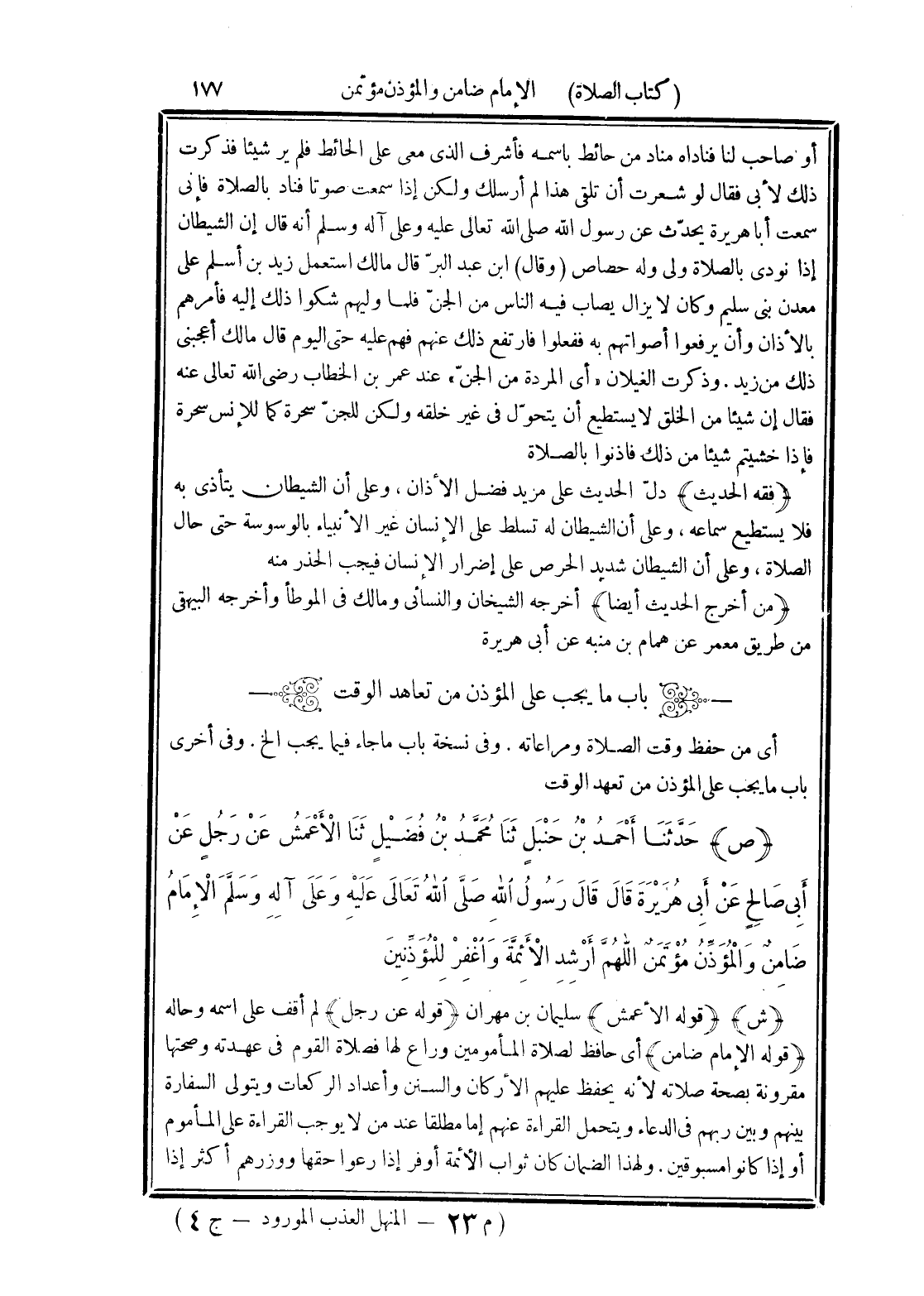 (ص) حَدَّثَنَا أَحْمَدُ بْنُ حَنْبَلٍ، حَدَّثَنَا مُحَمَّدُ بْنُ فُضَيْلٍ، ثَنَا الْأَعْمَشُ، عَنْ رَجُلٍ، عَنْ أَبِي صَالِحٍ، عَنْ أَبِي هُرَيْرَةَ، قَالَ: قَالَ رَسُولُ اللَّهِ صَلَّى اللهُ تَعَالَى عَلَيْهِ وَعَلَى آلِهِ وسَلَّمَ: «الْإِمَامُ ضَامِنٌ وَالْمُؤَذِّنُ مُؤْتَمَنٌ، اللَّهُمَّ أَرْشِدِ الْأَئِمَّةَ وَاغْفِرْ لِلْمُؤَذِّنِينَ».