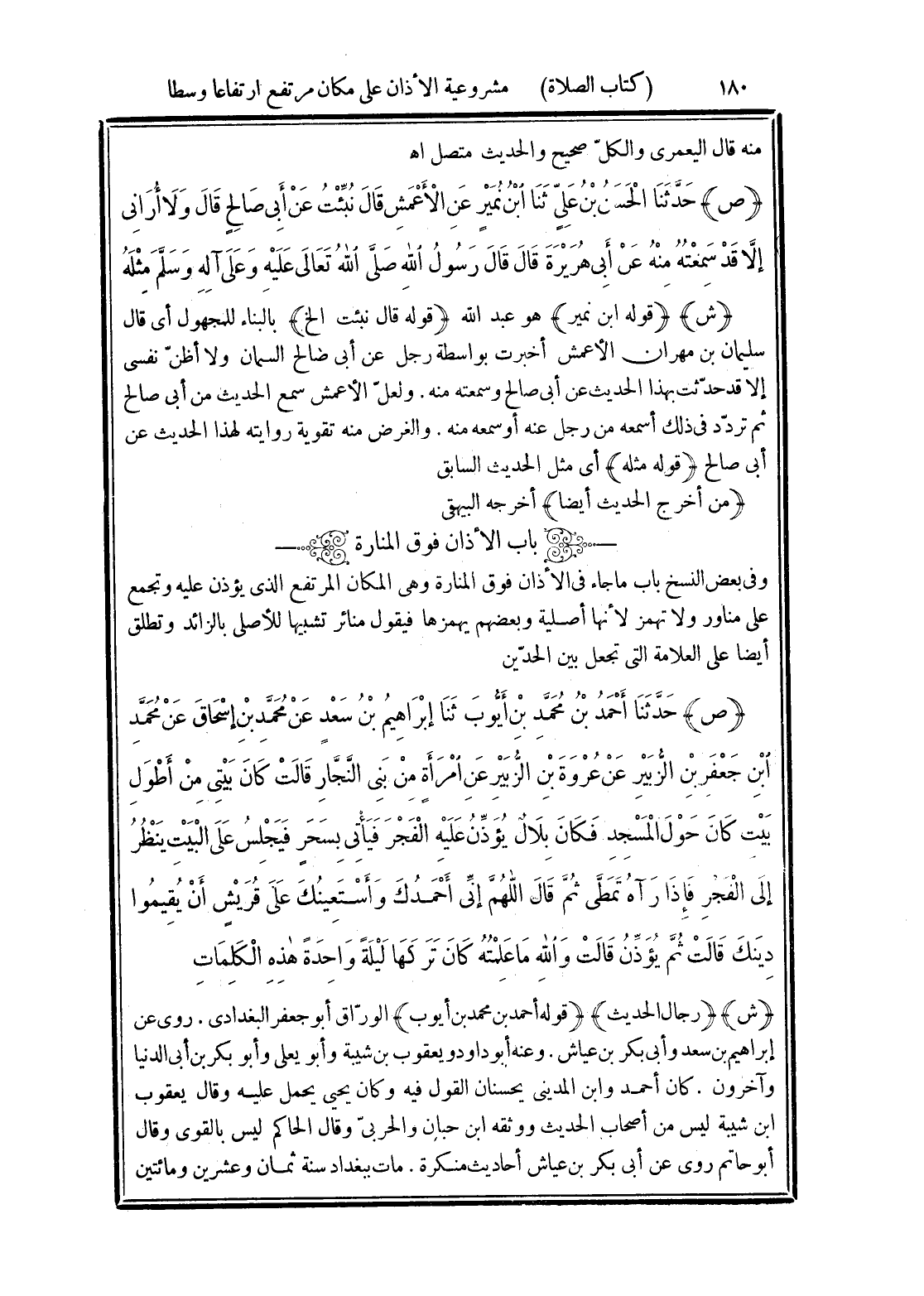وفي بعض النسخ باب ما جاء في الأذان فوق المنارة وهي المكان المرتفع الذى يؤذن عليه وتجمع على مناور ولا تهمز لأنها أصلية وبعضهم يهمزها فيقول منائر تشبيها للأصلى بالزائد وتطلق أيضا على العلامة التي تجعل بين الحدّين