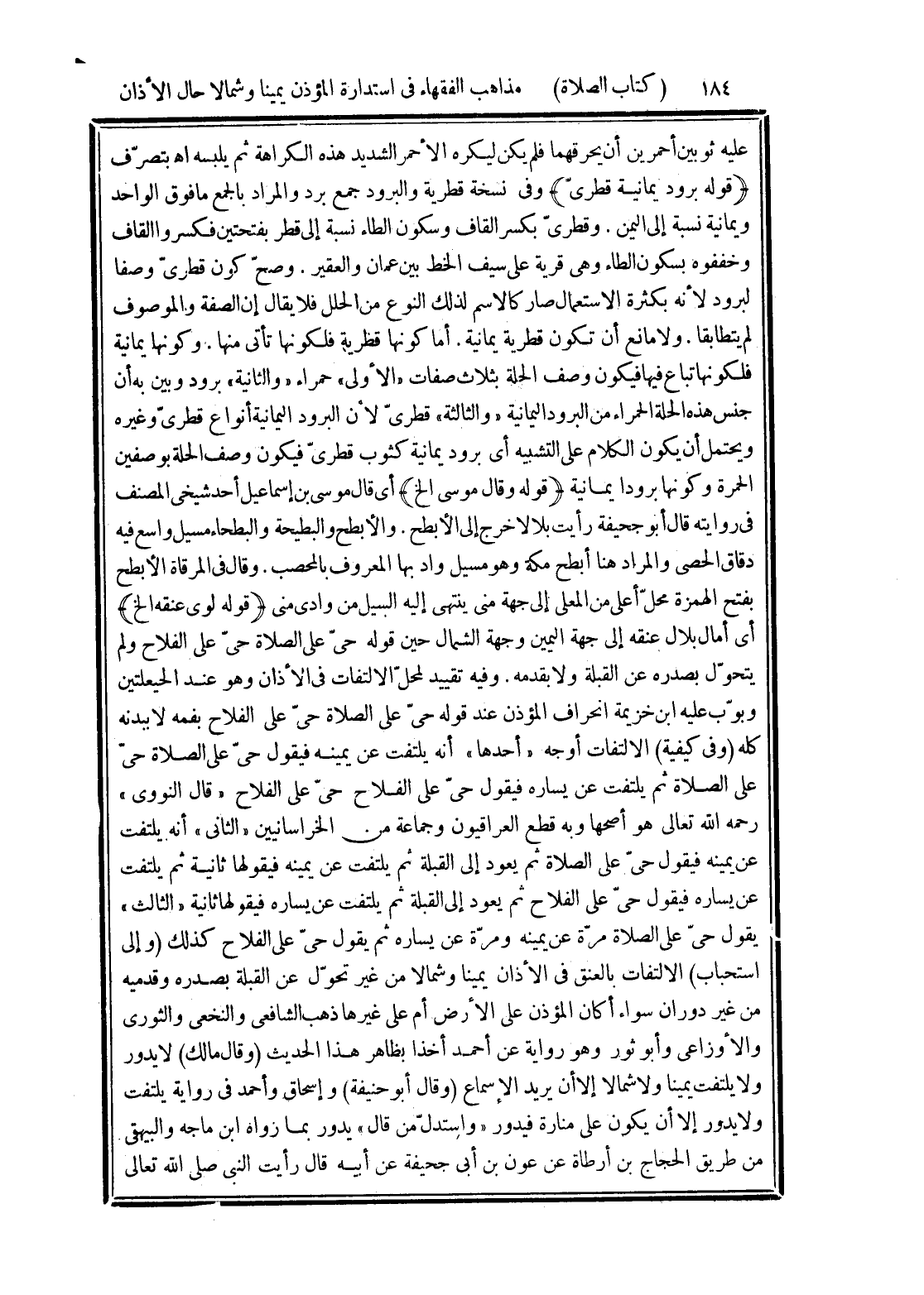 (قوله لوى عنقه الخ) أى أمال بلال عنقه إلى جهة اليمن وجهة الشمال حين قوله حىّ على الصلاة حىّ على الفلاح ولم يتحوّل بصدره عن القبلة ولا بقدمه. وفيه تقييد لمحلّ الالتفات في الأذان وهو عند الحيعلتين وبوّب عليه ابن خزيمة انحراف المؤذن عند قوله حىّ على الصلاة حىّ على الفلاح بفمه لا ببدنه كله (وفي كيفية) الالتفات أوجه "أحدها" أنه يلتفت عن يمينه فيقول حىّ على الصلاة حىّ على الصلاة ثم يلتفت عن يساره فيقول حىّ على الفلاح حىّ على الفلاح "قال النووى" رحمه الله تعالى هو أصحها وبه قطع العراقيون وجماعة من الخراسانيين "الثانى" أنه يلتفت عن يمينه فيقول حيّ على الصلاة ثم يعود إلى القبلة ثم يلتفت عن يمينه فيقولها ثانية ثم يلتفت عن يساره فيقول حيّ على الفلاح ثم يعود إلى القبلة ثم يلتفت عن يساره فيقولها ثانية "الثالث" يقول حىّ على الصلاة مرّة عن يمينه ومرّة عن يساره ثم يقول حىّ على الفلاح كذلك (وإلى استحباب) الالتفات بالعنق في الأذان يمينا وشمالا من غير تحول عن القبلة بصدره وقدميه من غير دوران سواء أكان المؤذن على الأرض أم على غيرها ذهب الشافعى والنخعى والثورى والأوزاعى وأبو ثور وهو رواية عن أحمد أخذا بظاهر هذا الحديث (وقال مالك) لا يدور ولا يلتفت يمينا ولا شمالا إلا أن يريد الإسماع (وقال أبو حنيفة) وإسحاق وأحمد في رواية يلتفت ولا يدور إلا أن يكون على منارة فيدور "واستدلّ من قال" يدور مما زواة ابن ماجه والبيهقي من طريق الحجاج بن أرطاة عن عون بن أبى جحيفة عن أبيه قال رأيت النبي صلى الله تعالى