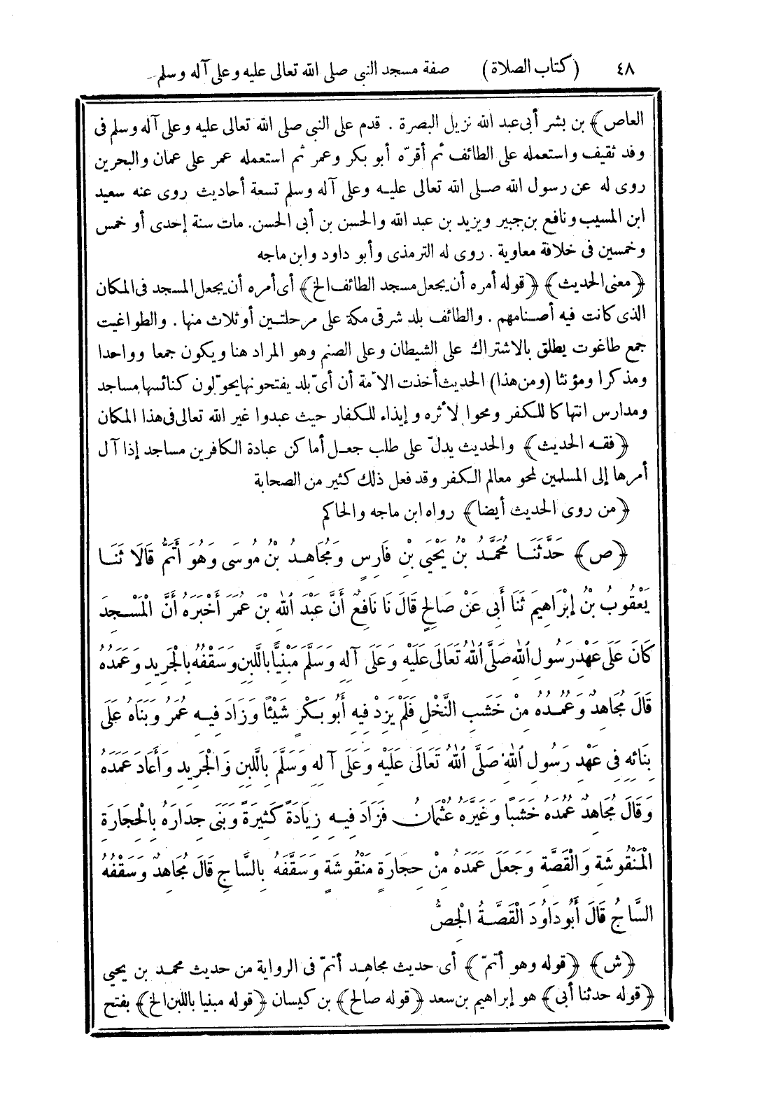 (ص) حَدَّثَنَا مُحَمَّدُ بْنُ يَحْيَى بْنِ فَارِسٍ، وَمُجَاهِدُ بْنُ مُوسَى، وَهُوَ أَتَمُّ، قَالَا: ثَنَا يَعْقُوبُ بْنُ إِبْرَاهِيمَ، ثَنَا أَبِي، عَنْ صَالِحٍ، حَدَّثَنَا نَافِعٌ، أَنَّ عَبْدَ اللَّهِ بْنَ عُمَرَ، أَخْبَرَهُ، "أَنَّ الْمَسْجِدَ كَانَ عَلَى عَهْدِ رَسُولِ اللَّهِ صَلَّى اللهُ تَعَالَى عَلَيْهِ وَعَلَى آلِهِ وسَلَّمَ، مَبْنِيًّا بِاللَّبِنِ وسَقْفُهُ بالْجَرِيدِ وعَمَدُهُ قال مجاهد وَعُمُدُهُ مِنْ خَشَبِ النَّخْلِ - فَلَمْ يَزِدْ فِيهِ أَبُو بَكْرٍ شَيْئًا، وَزَادَ فِيهِ عُمَرُ وَبَنَاهُ عَلَى بِنَائِهِ فِي عَهْدِ رَسُولِ اللَّهِ صَلَّى اللهُ تَعَالَى عَلَيْهِ وَعَلَى آلِهِ وسَلَّمَ بِاللَّبِنِ وَالْجَرِيدِ وَأَعَادَ عَمَدَهُ -قَالَ مُجَاهِدٌ: عُمُدَهُ خَشَبًا- وَغَيَّرَهُ عُثْمَانُ فَزَادَ فِيهِ زِيَادَةً كَثِيرَةً، وَبَنَى جِدَارَهُ بِالْحِجَارَةِ الْمَنْقُوشَةِ وَالْقَصَّةِ، وَجَعَلَ عُمُدَهُ مِنْ حِجَارَةٍ مَنْقُوشَةٍ وَسَقْفَهُ بِالسَّاجِ -قَالَ مُجَاهِدٌ: وَسَقَّفَهُ السَّاجَ-"، قَالَ أَبُو دَاوُدَ: الْقَصَّةُ: الْجِصُّ