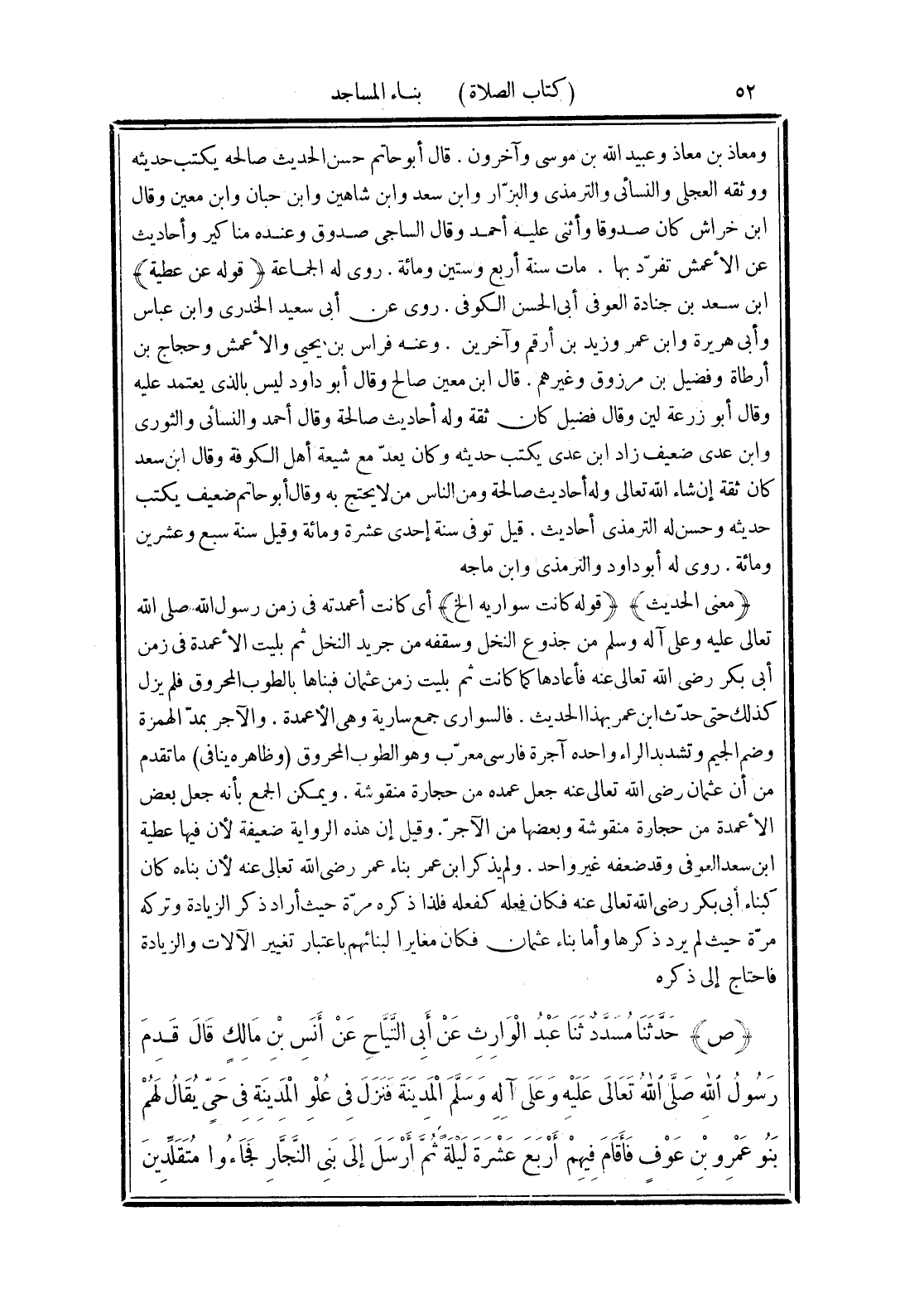 (قوله كانت سواريه الخ) أى كانت أعمدته في زمن رسول الله صلى الله تعالى عليه وعلى آله وسلم من جذوع النخل وسقفه من جريد النخل ثم بليت الأعمدة في زمن أبى بكر رضي الله تعالى عنه فأعادها كما كانت ثم بليت زمن عثمان فبناها بالطوب المحروق فلم يزل كذلك حتى حدّث ابن عمر بهذا الحديث. فالسوارى جمع سارية وهى الأعمدة. والآجر بمدّ الهمزة وضم الجيم وتشديد الراء واحده آجرة فارسى معرّب وهو الطوب المحروق (وظاهره ينافى) ما تقدم من أن عثمان رَضِيَ اللَّهُ تَعَالَى عَنْهُ جعل عمده من حجارة منقوشة. ويمكن الجمع بأنه جعل بعض الأعمدة من حجارة منقوشة وبعضها من الآجرّ. وقيل إن هذه الرواية ضعيفة لأن فيها عطية ابن سعد العوفى وقد ضعفه غير واحد. ولم يذكر ابن عمر بناء عمر رَضِيَ اللَّهُ تَعَالَى عَنْهُ لأن بناءه كان كبناء أبى بكر رَضِيَ اللَّهُ تَعَالَى عَنْهُ فكان فعله كفعله فلذا ذكره مرّة حيث أراد ذكر الزيادة وتركه مرّة حيث لم يرد ذكرها وأما بناء عثمان فكان مغايرا لبنائهم لاعتبار تغيير الآلات والزيادة فاحتاج إلى ذكره