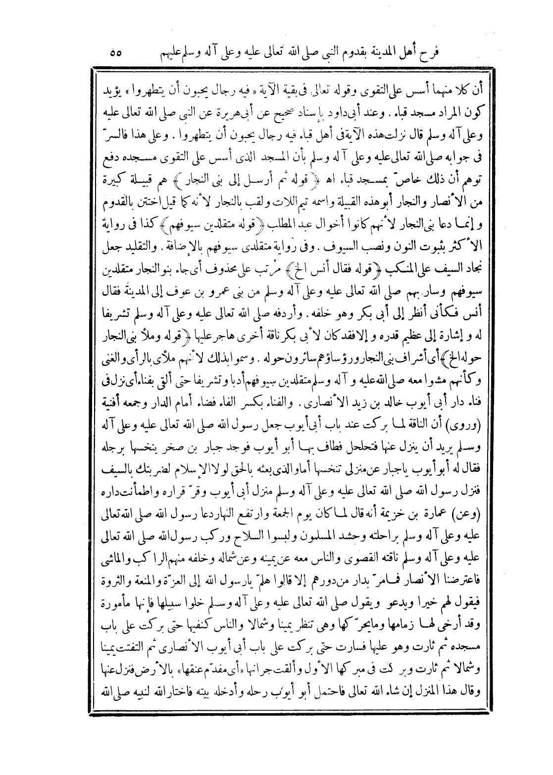 (وروى) أن الناقة لما بركت عند باب أبى أيوب جعل رسول الله صلى الله تعالى عليه وعلى آله وسلم يريد أن ينزل عنها فتحلحل فطاف بها أبو أيوب فوجد جبار بن صخر ينخسها برجله فقال له أبو أيوب يا جبار عن منزلى تنخسها أما والذى بعثه بالحق لولا الإسلام لضربتك بالسيف فنزل رسول الله صلى الله تعالى عليه وعلى آله وسلم منزل أبى أيوب وقرّ قراره واطمأنت داره (وعن) عمارة بن خزيمة أنه قال لما كان يوم الجمعة وارتفع النهار دعا رسول الله صلى الله تعالى عليه وعلى آله وسلم براحلته وحشد المسلمون ولبسوا السلاح وركب رسول الله صلى الله تعالى عليه وعلى آله وسلم ناقته القصوى والناس معه عن يمينه وعن شماله وخلفه منهم الراكب والماشي فاعترضنا الأنصار فما مرّ بدار من دورهم إلا قالوا هلمّ يا رسول الله إلى العزّة والمنعة والثروة فيقول لهم خيرا ويدعو ويقول صلى الله تعالى عليه وعلى آله وسلم خلوا سبيلها فإنها مأمورة وقد أرخى لها زمامها وما يحركها وهى تنظر يمينا وشمالا والناس كنفيها حتى بركت على باب مسجده ثم ثارت وهو عليها فسارت حتى بركت على باب أبى أيوب الأنصارى ثم التفتت يمينا وشمالا ثم ثارت وبركت في مبركها الأول وألقت جرانها "أى مقدّم عنقها" بالأرض فنزل عنها وقال هذا المنزل إن شاء الله تعالى فاحتمل أبو أيوب رحله وأدخله بيته فاختار الله لنبيه صلى الله