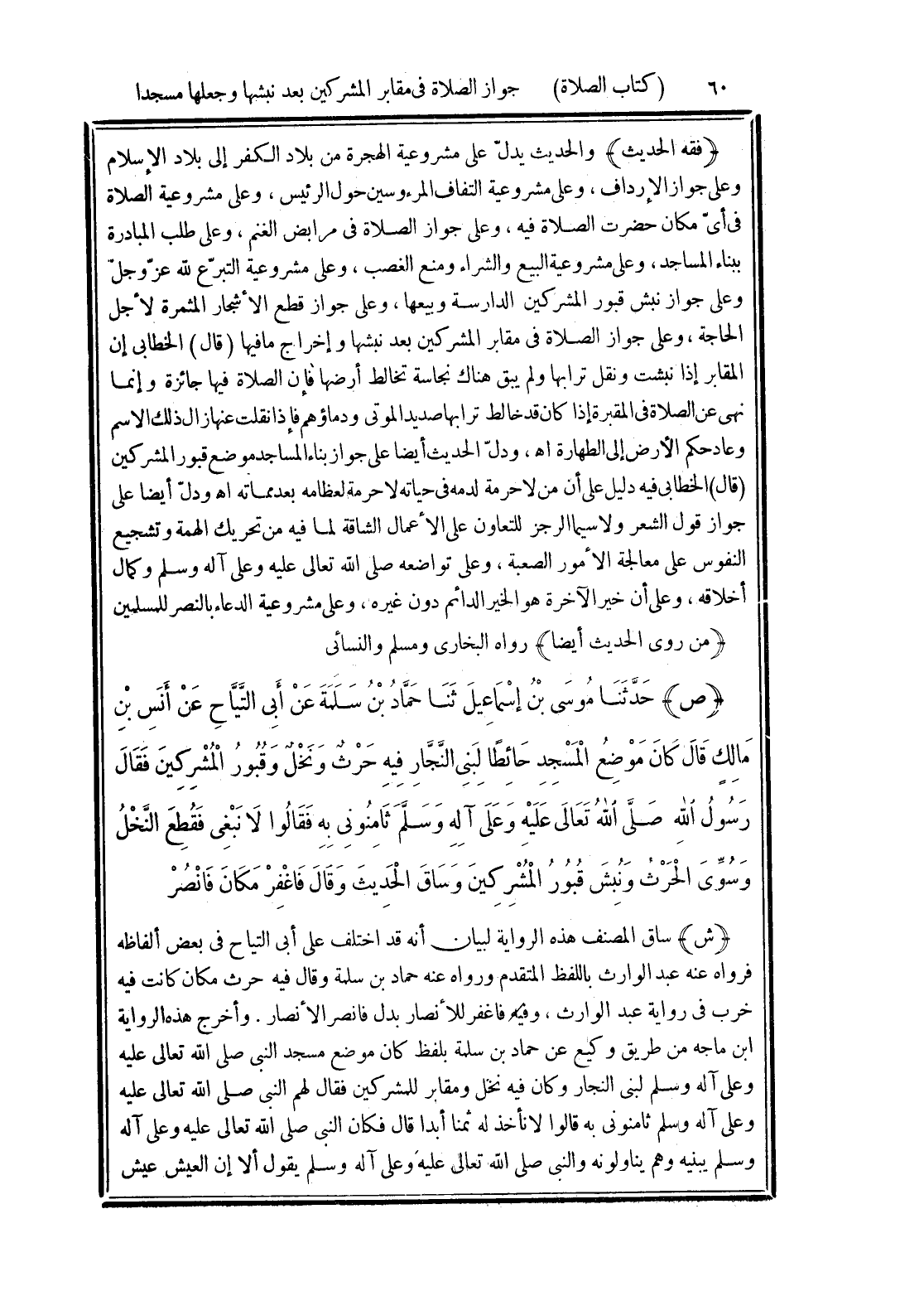 (ص) حَدَّثَنَا مُوسَى بْنُ إِسْمَاعِيلَ، ثَنَا حَمَّادُ بْنُ سَلَمَةَ، عَنْ أَبِي التَّيَّاحِ، عَنْ أَنَسِ بْنِ مَالِكٍ، قَالَ: كَانَ مَوْضِعُ الْمَسْجِدِ حَائِطًا لِبَنِي النَّجَّارِ فِيهِ حَرْثٌ وَنَخْلٌ، وَقُبُورُ الْمُشْرِكِينَ، فَقَالَ رَسُولُ اللَّهِ صَلَّى اللهُ تَعَالَى عَلَيْهِ وَعَلَى آلِهِ وسَلَّمَ «ثَامِنُونِي بِهِ» فَقَالُوا: لَا نَبْغِي، فَقُطِعَ النَّخْلُ وَسَوَّى الْحَرْثَ وَنُبَشَ قُبُورُ الْمُشْرِكِينَ، وَسَاقَ الْحَدِيثَ، وَقَالَ: «فَاغْفِرْ» مَكَانَ «فَانْصُرْ».