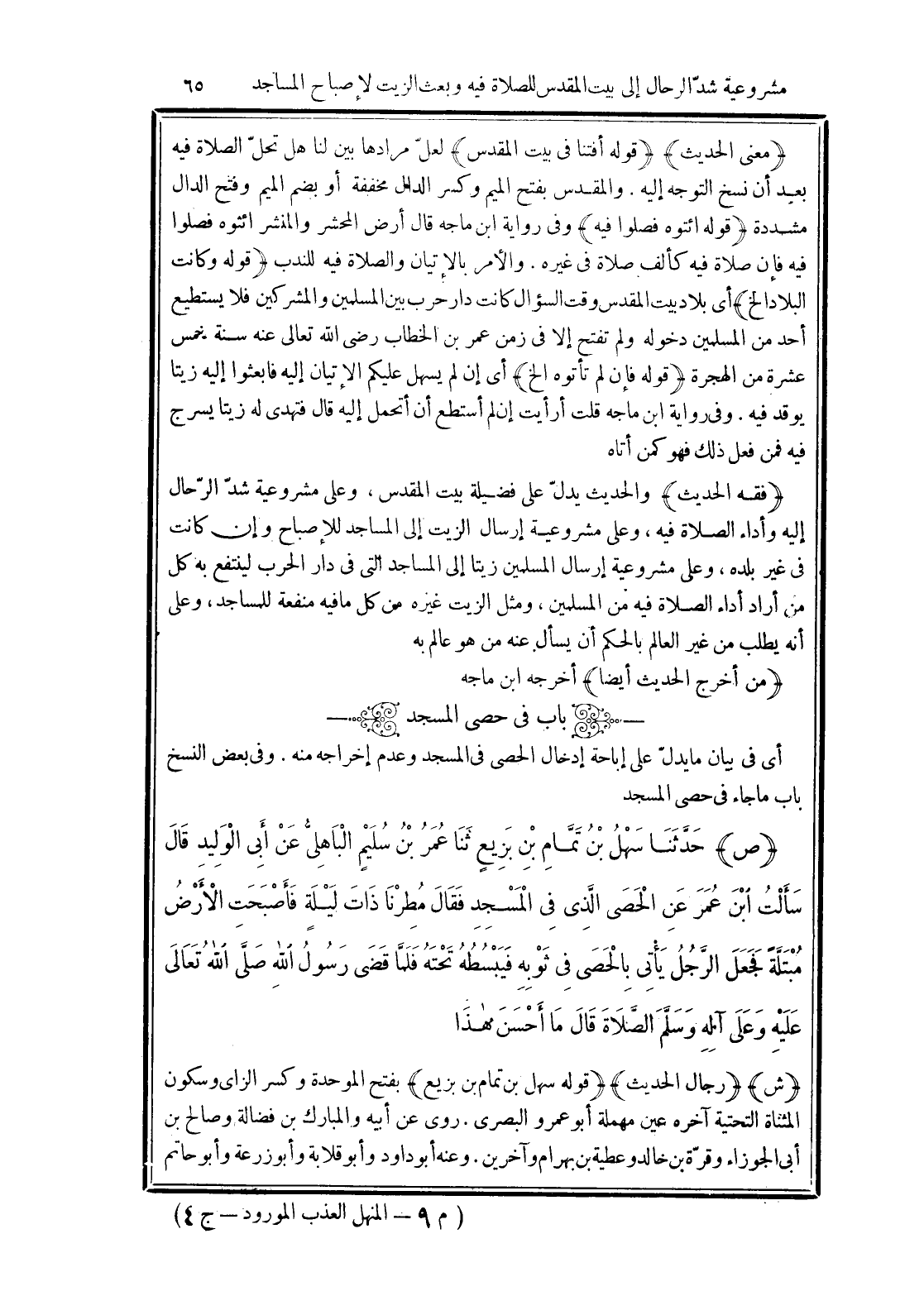 (فقه الحديث) والحديث يدلّ على فضيلة بيت المقدس، وعلى مشروعية شدّ الرّحال إليه وأداء الصلاة فيه، وعلى مشروعية إرسال الزيت إلى المساجد للإصباح وإن كانت في غير بلده، وعلى مشروعية إرسال المسلمين زيتا إلى المساجد التي في دار الحرب لينتفع به كل من أراد أداء الصلاة فيه من المسلمين، ومثل الزيت غيره من كل ما فيه منفعة للمساجد، وعلى أنه يطلب من غير العالم بالحكم أن يسأل. عنه من هو عالم به